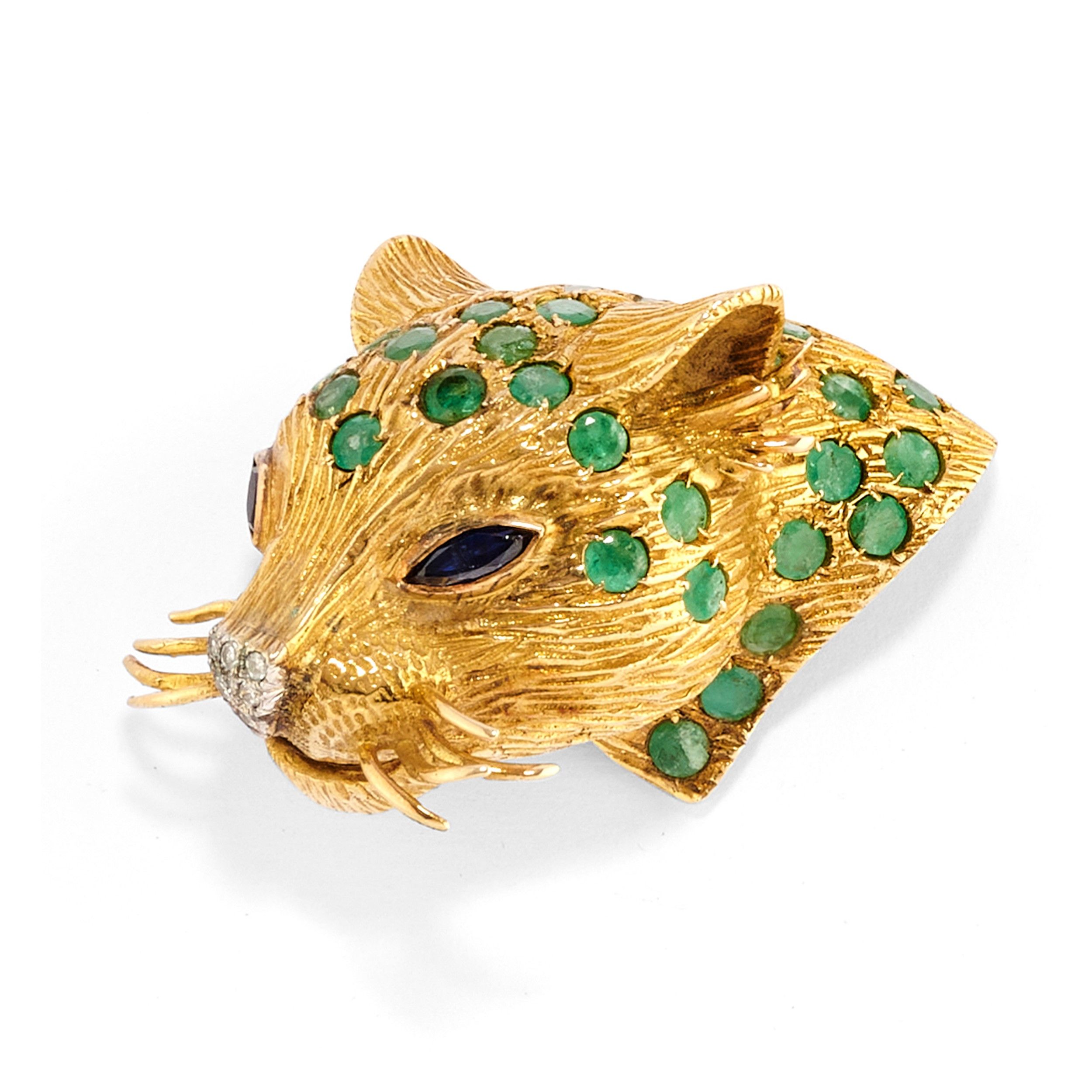 decorata da smeraldi taglio rotondo, zaffiri taglio navette agli occhi e piccoli diamanti taglio huit-huit.
