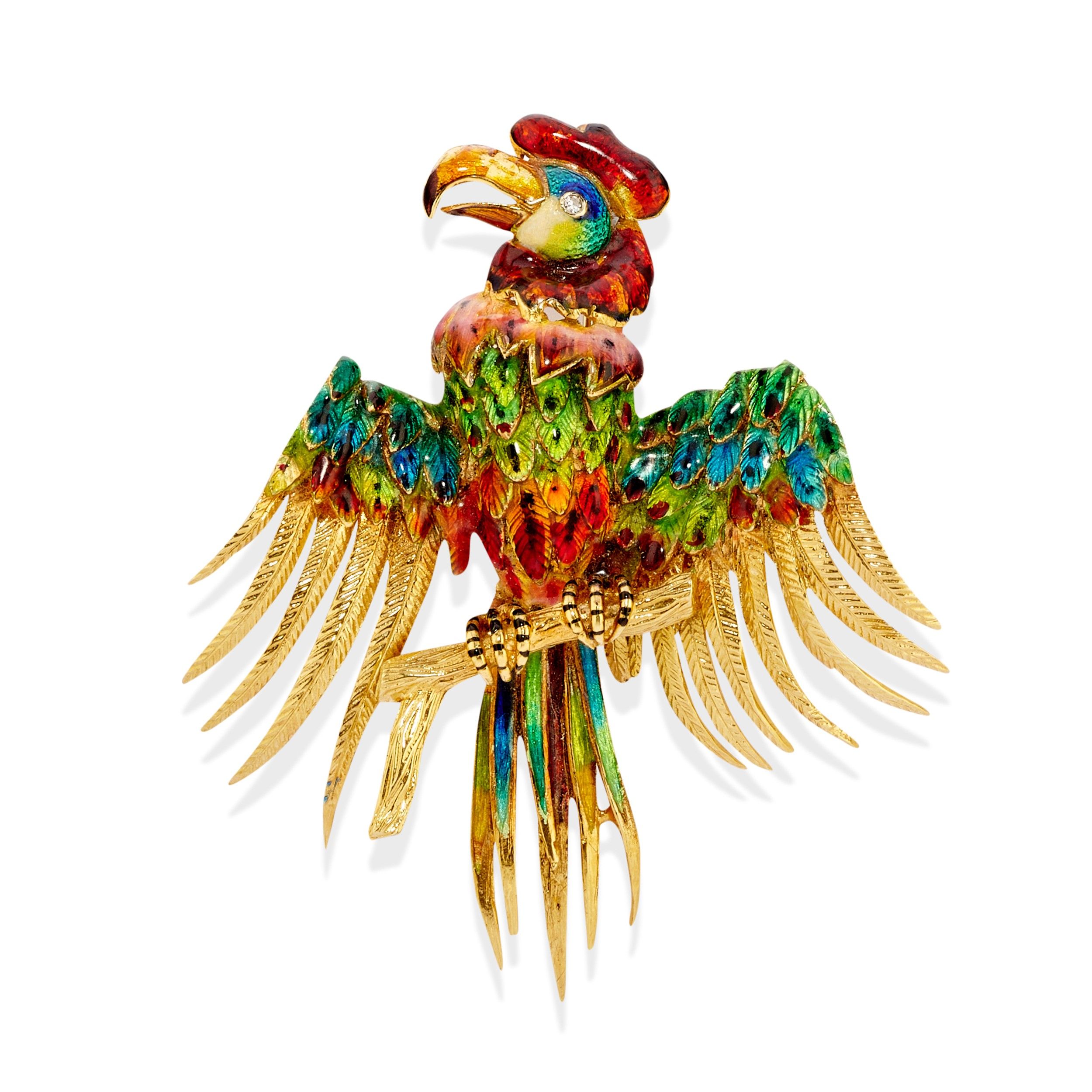 realizzata in smalto policromo e diamanti taglio huit-huit all'occhio.