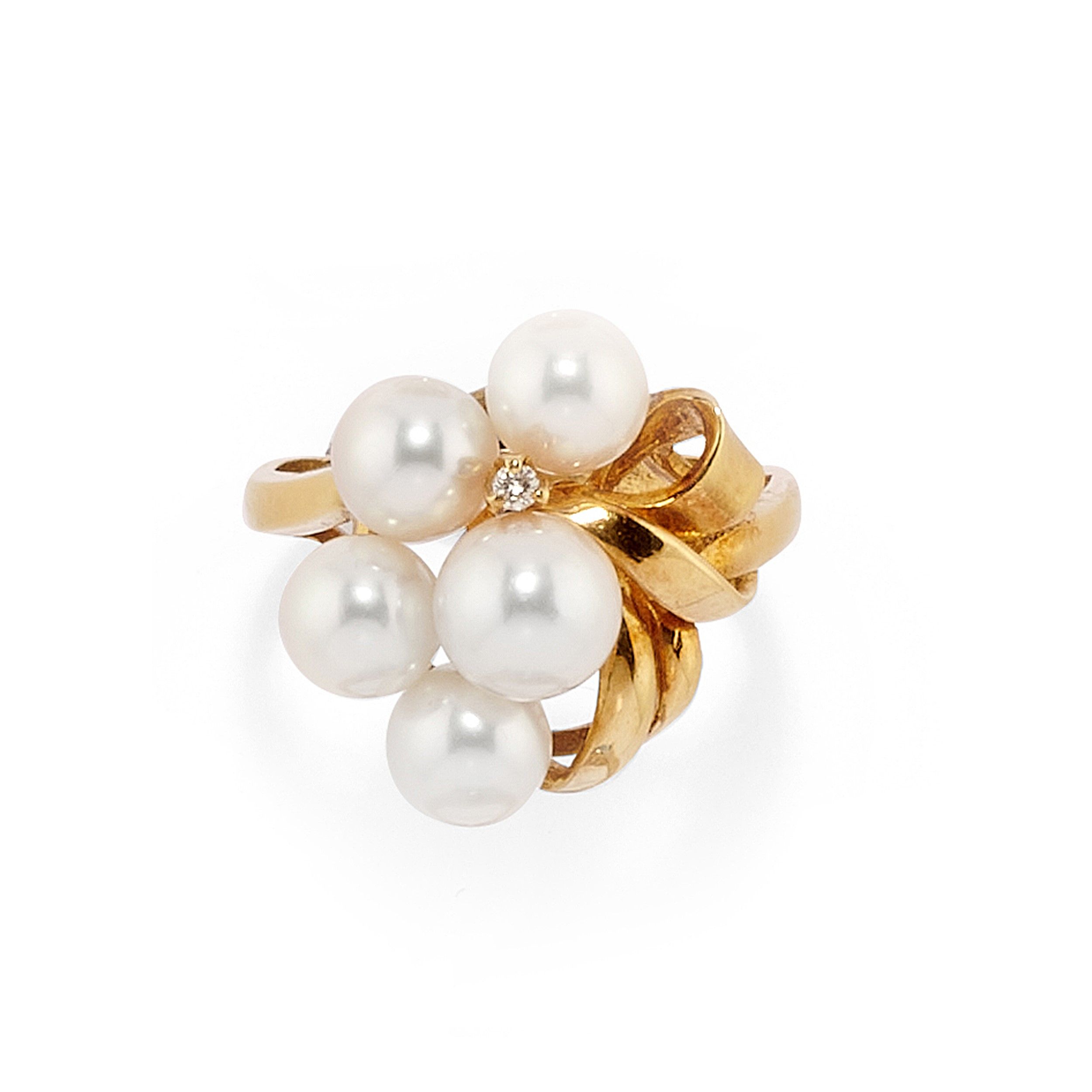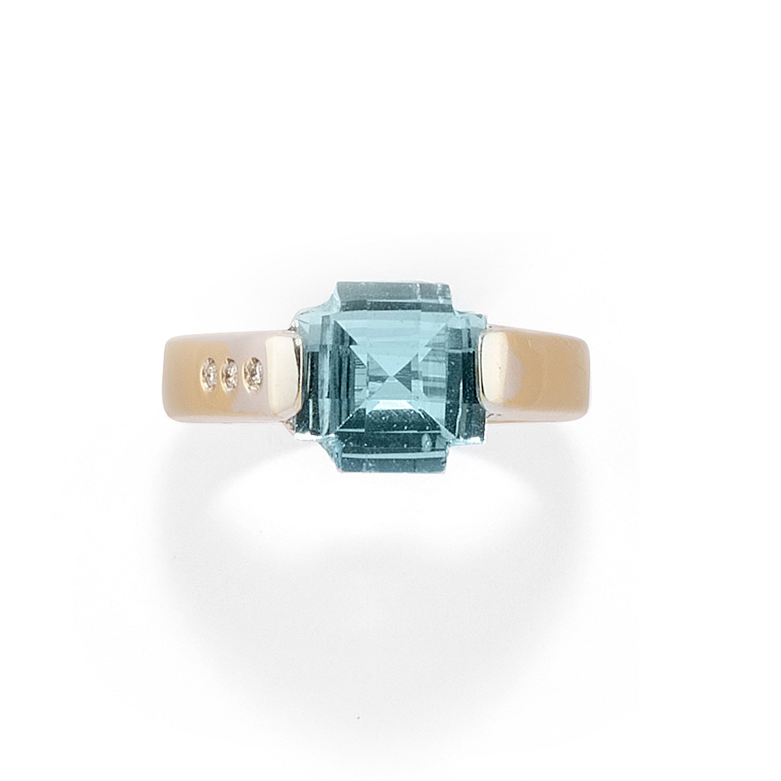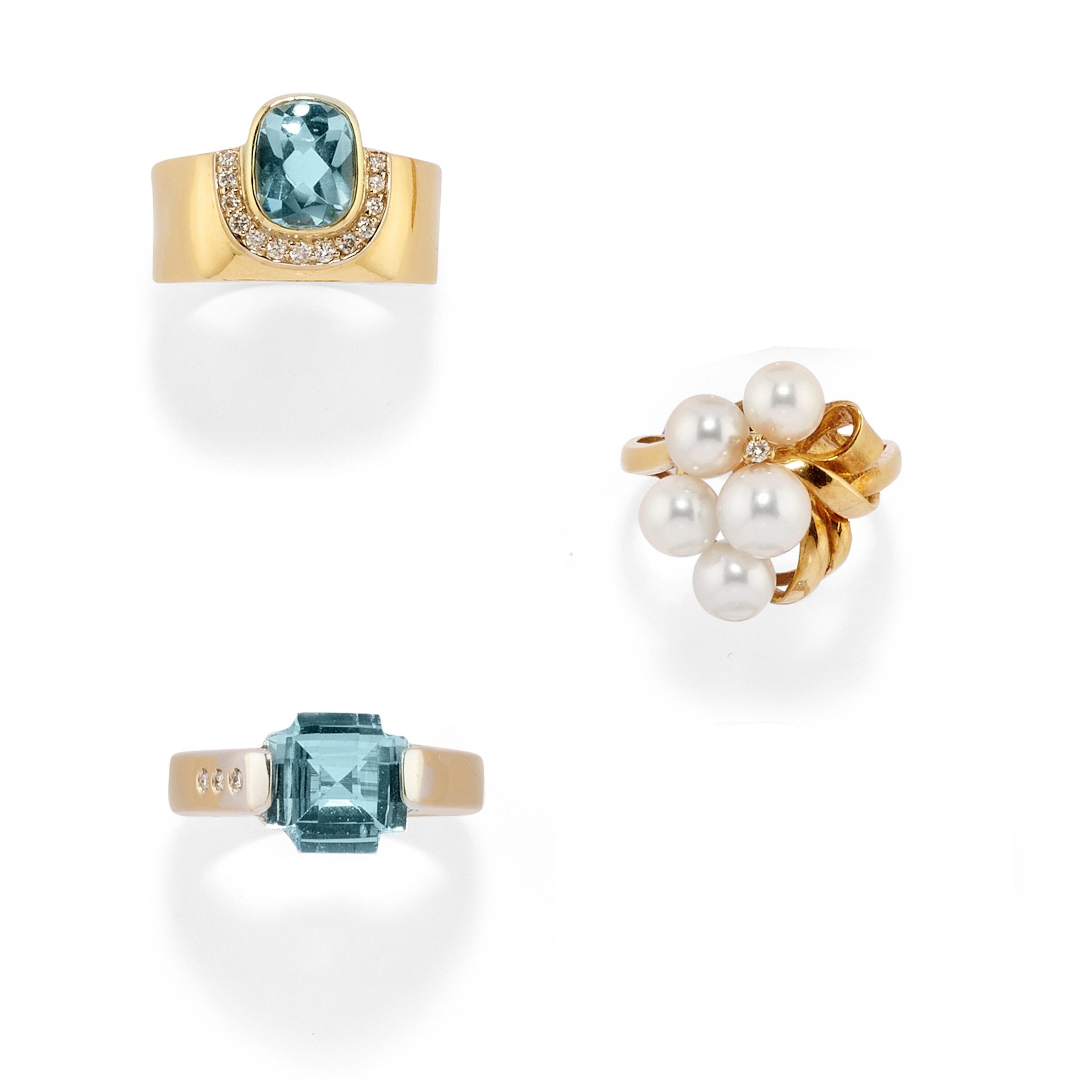 in oro bicolore 18k, Peso g 21,50 misure 14, 17, 21 uno con topazio azzurro taglio fantasia e piccoli diamanti taglio brillante, uno con topazio azzurro taglio ovale e diamanti taglio brillante, uno con perle coltivate e piccolo diamante taglio brillante.