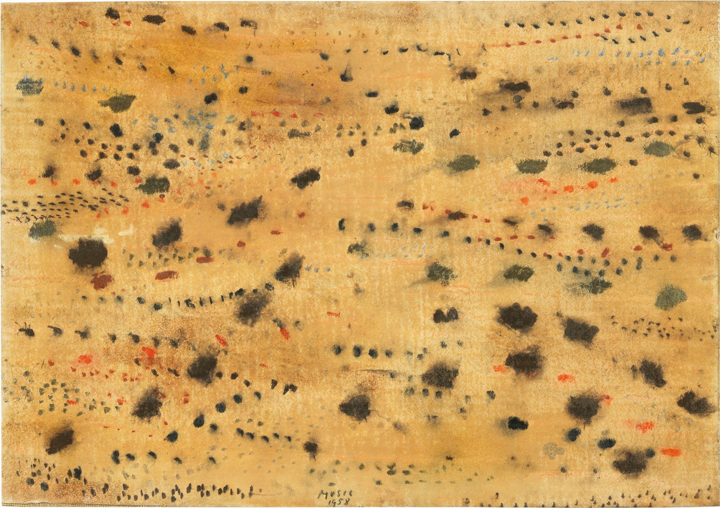 Gouache su carta applicata su tela, cm. 45x64 1958 Firma e data in basso al centro: Music / 1958; firma e data al verso della carta: Music / 1958; sulla tela: timbro Galleria d'Arte Moderna San Giorgio: timbro Galleria Il Traghetto, Venezia; sul telaio: timbro Colussa Galleria d'Arte, Udine: due timbri Galleria Il Traghetto, Venezia: timbro Galleria d'Arte Aldobrandeschi, Grosseto: etichetta Opera Esposta / Dicembre 2003 / Galleria / Artestudio Clocchiatti / Udine.