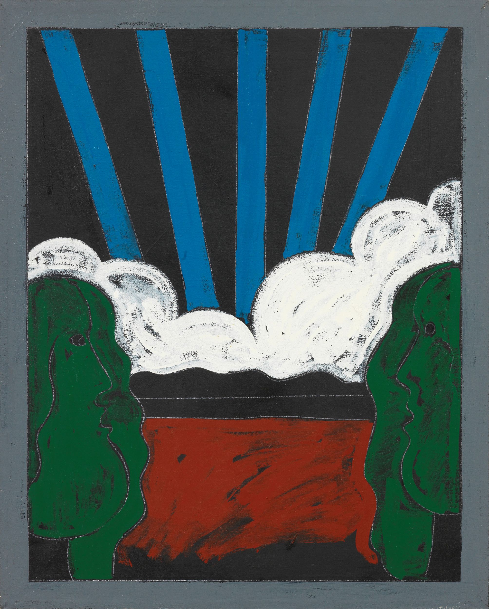 1975 Titolo, firma e data al verso sulla tela: Figure e paesaggio / Festa 1975.
