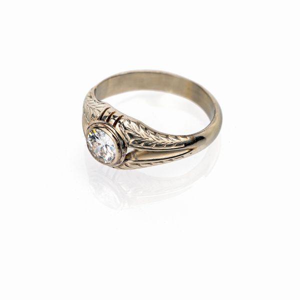 Oro bianco 750/000. Diamante in taglio rotondo ct. 0,60 ca. Peso complessivo gr. 5,10
