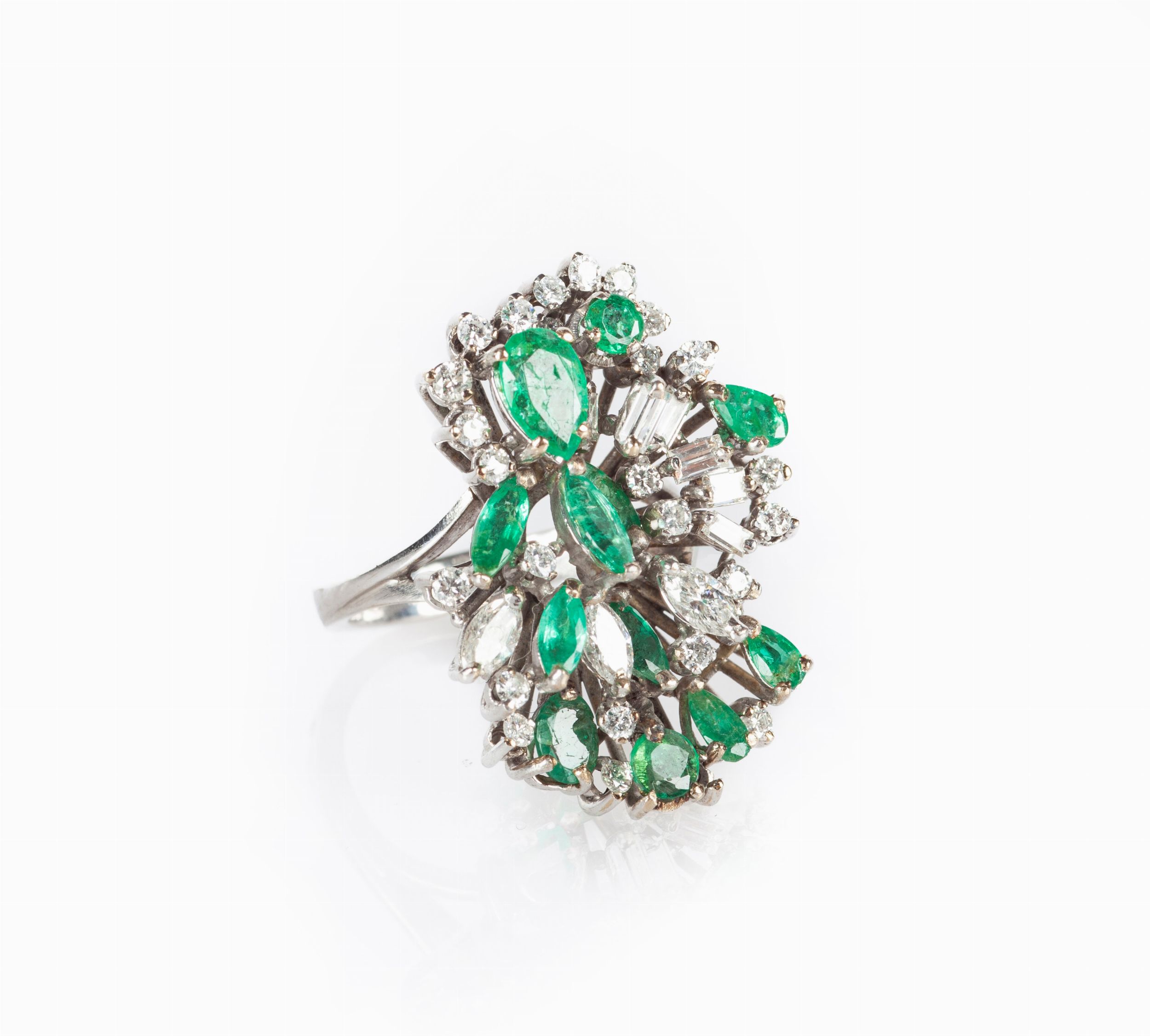 Oro bianco 750/000. Diamanti in taglio rotondo, baguettes e navette. Smeraldi in taglio navette e goccia. Peso complessivo gr. 11,30.