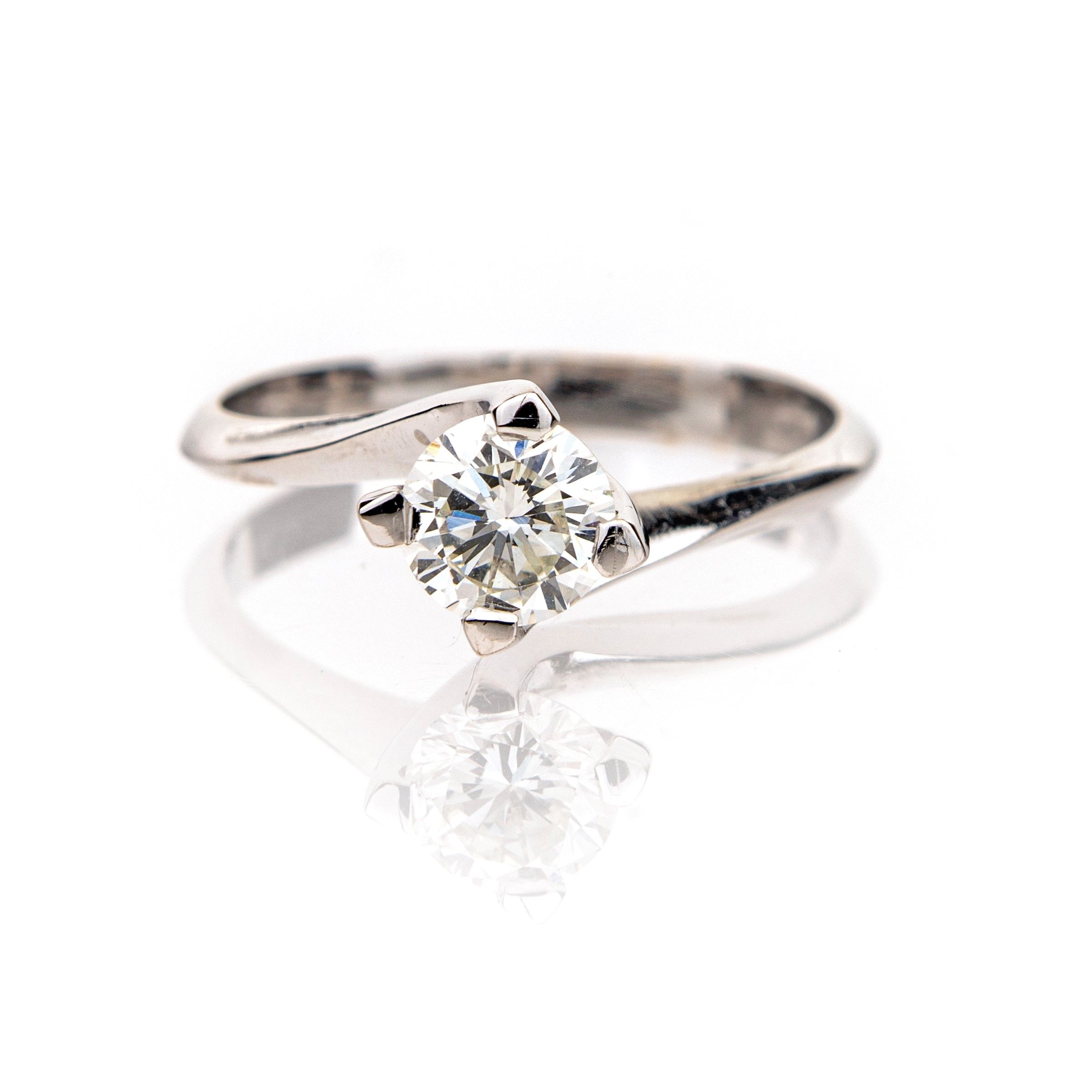 Oro bianco 750/000. Diamante in taglio rotondo brillante ct. 0,75 ca, prob. H-VVS. Peso complessivo gr. 2,50