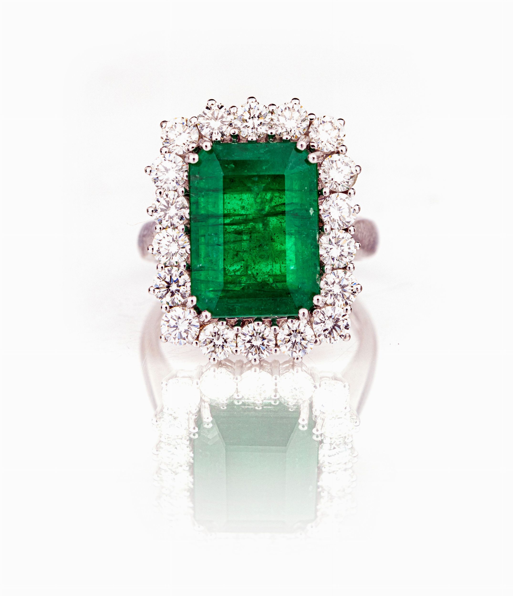 Oro bianco 750/000. Smeraldo in taglio smeraldo Colombia ct. 6, diamanti in taglio rotondo brillante ct. 2,80 G -VS. Peso complessivo gr. 8,90. Corredato di certificazione gemmologica.