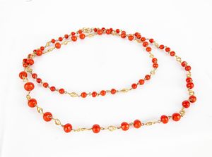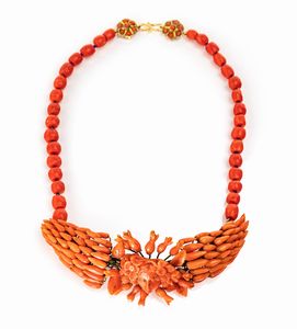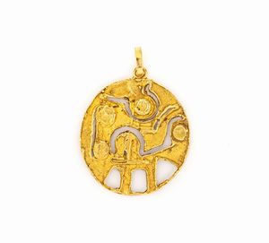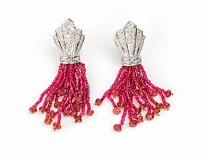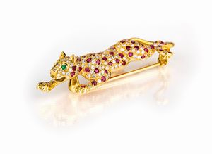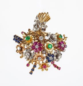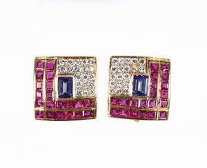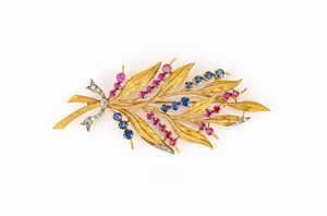 cm 10 x 5 Oro giallo 750/000. Zaffiri in taglio rotondo ct. 1,30 ca, rubini in taglio rotondo ct. 1,90 ca. Peso [..]