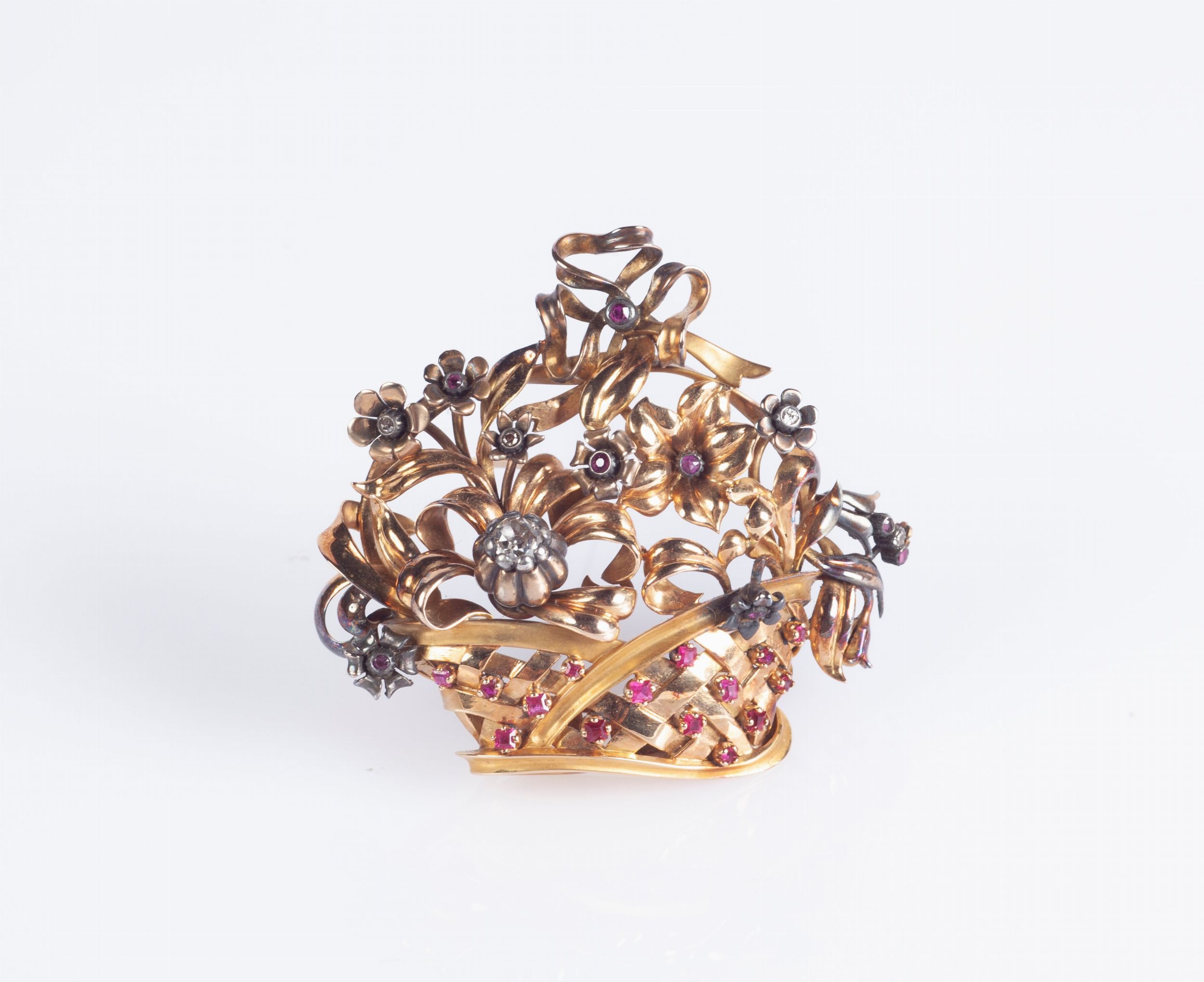 Cazzaniga spilla anni '40 in oro, diamanti e rubini