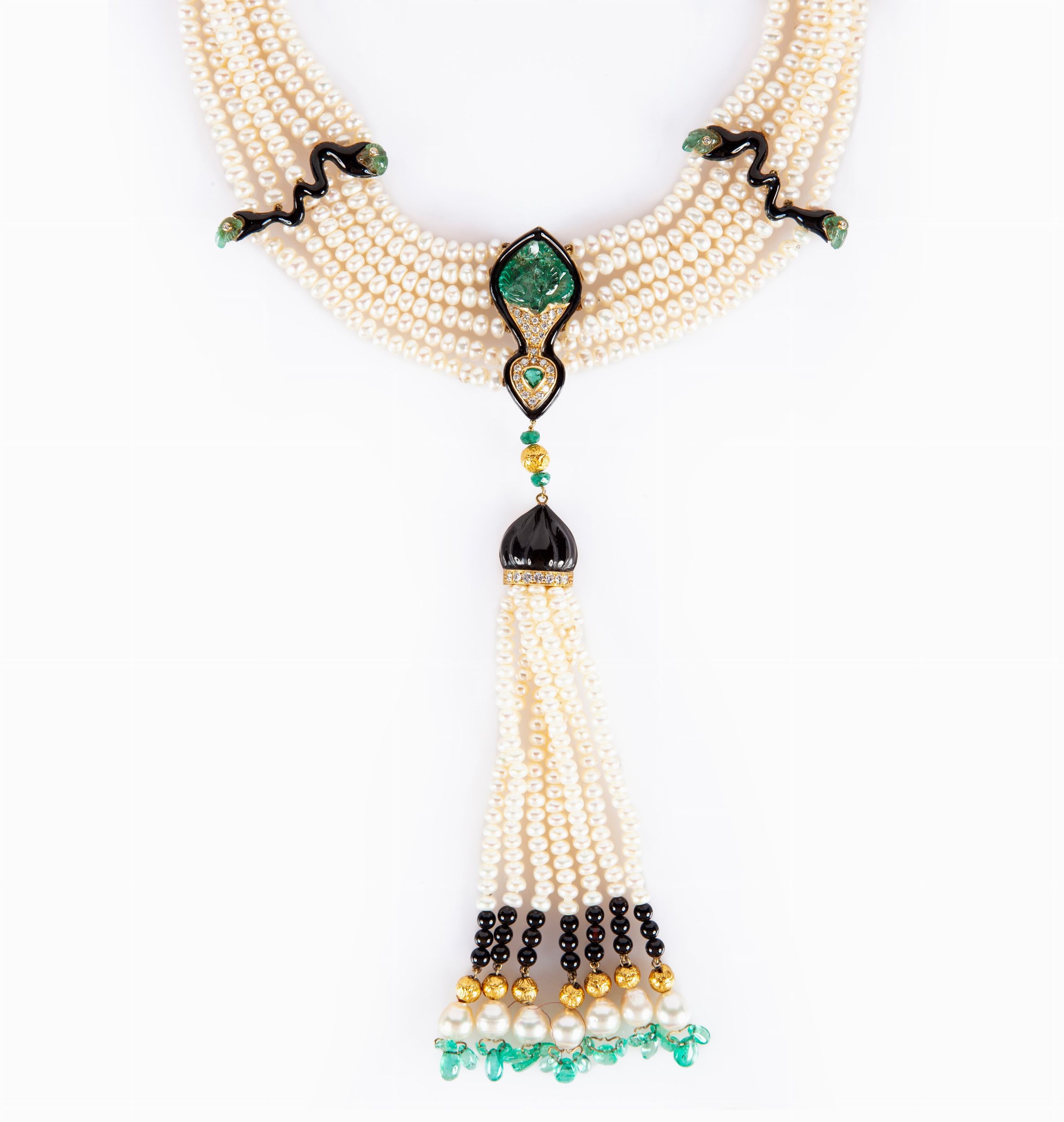 Collana di perle, smeraldi incisi, brillanti e smalti