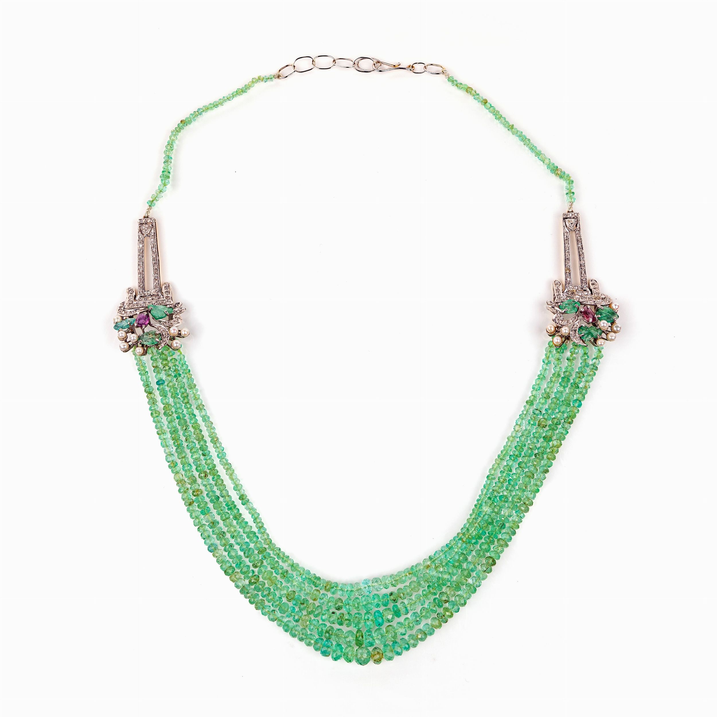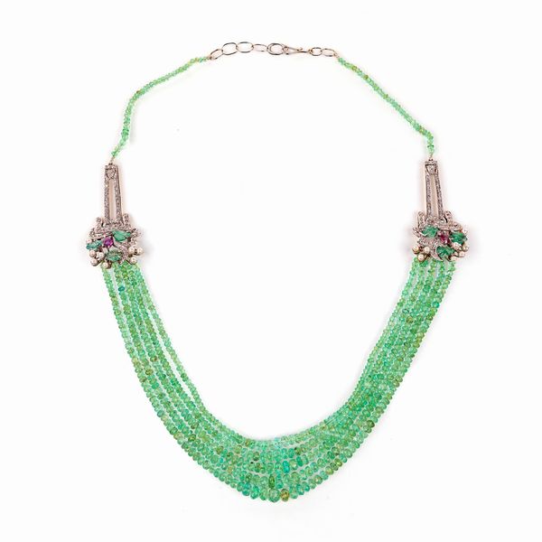 Collana in oro, argento, 5 fili di smeraldi, diamanti e tormaline