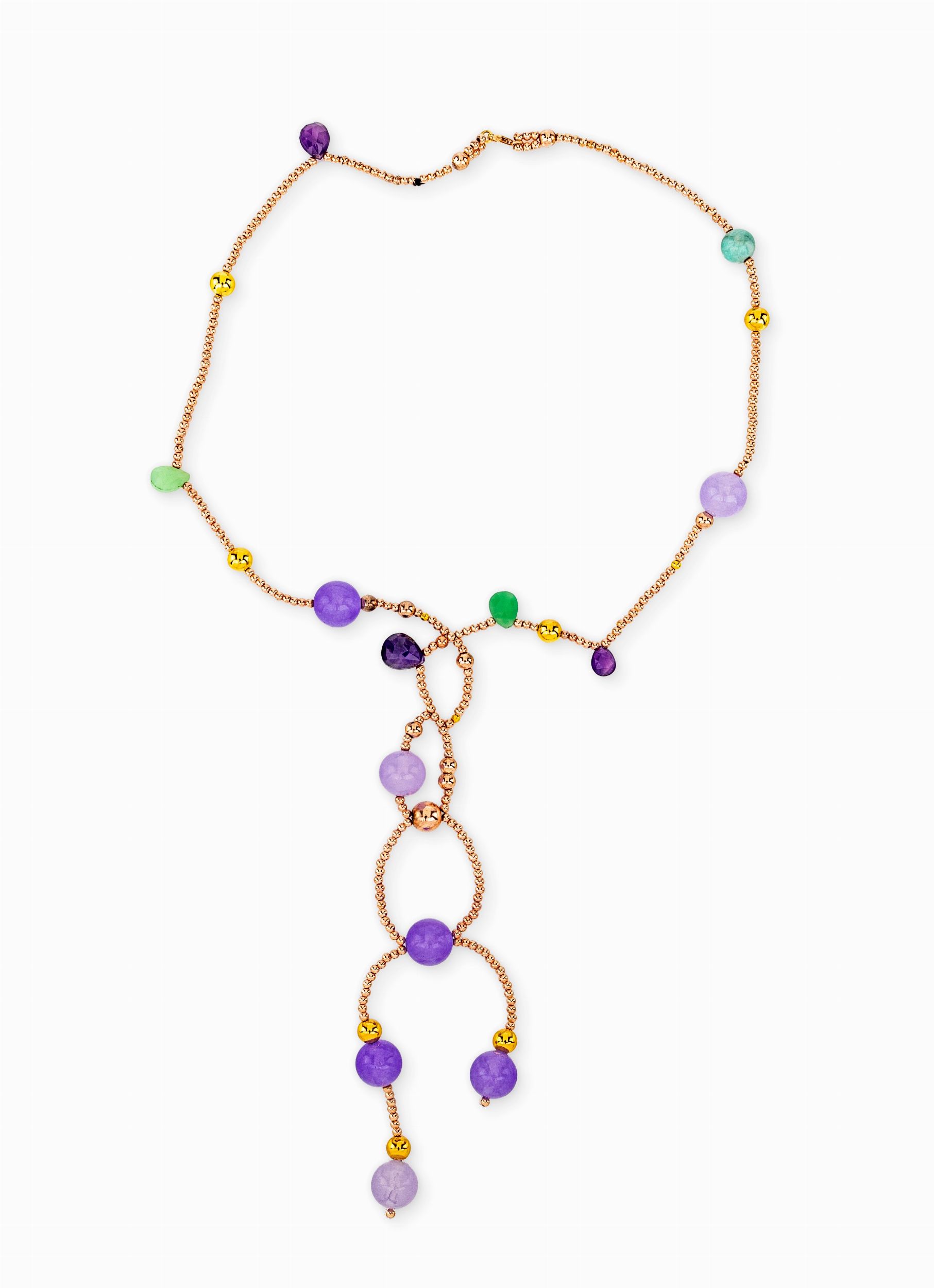 Collana in oro, metallo dorato, ematite rosa, giada e giada viola
