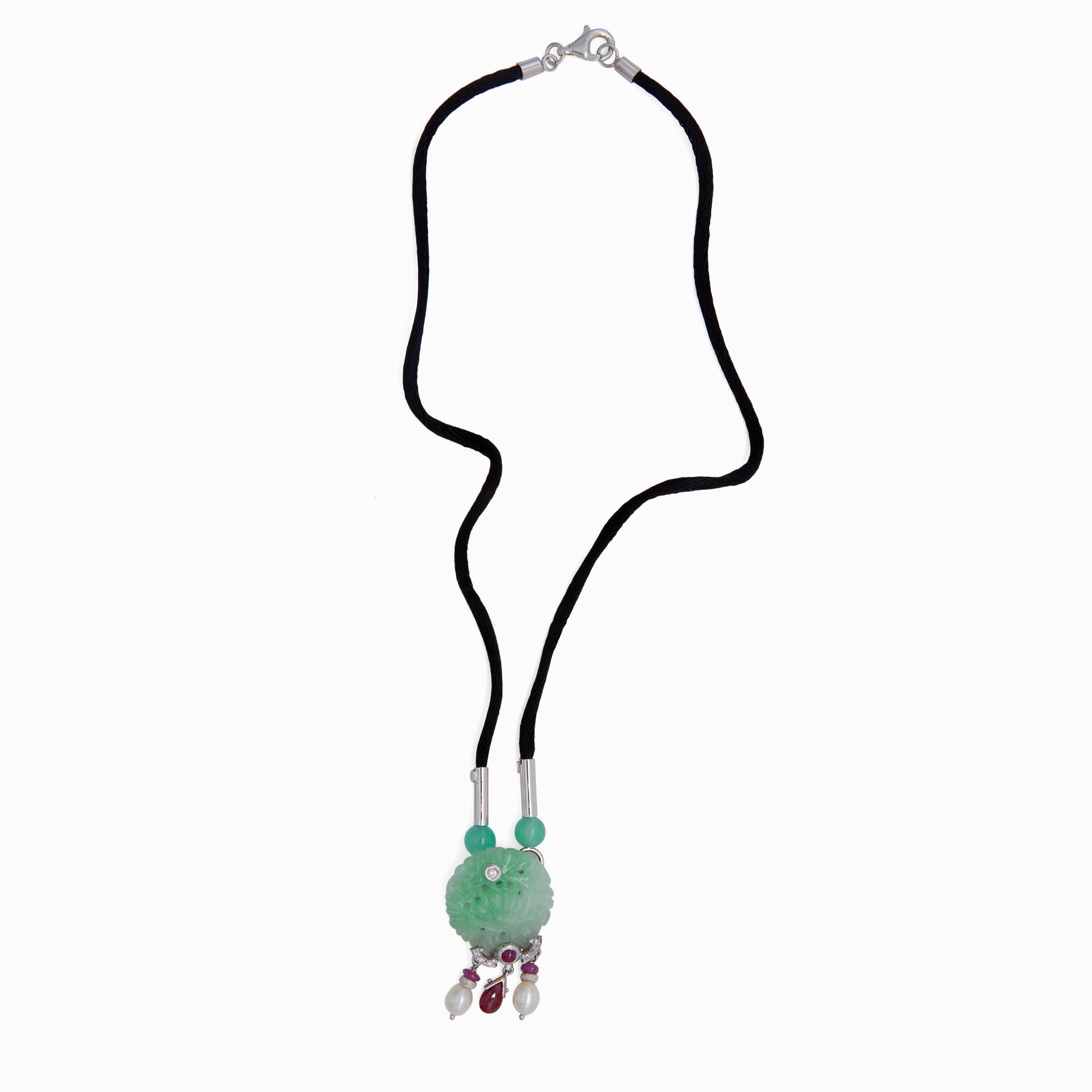 Collana pendente in oro, giada, perle, rubini e brillanti