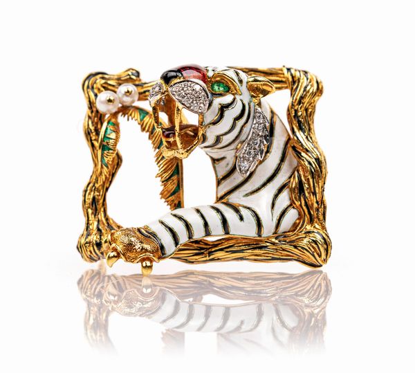 Oro giallo 750/000. Diamanti, smeraldi e smalti.