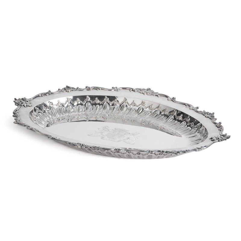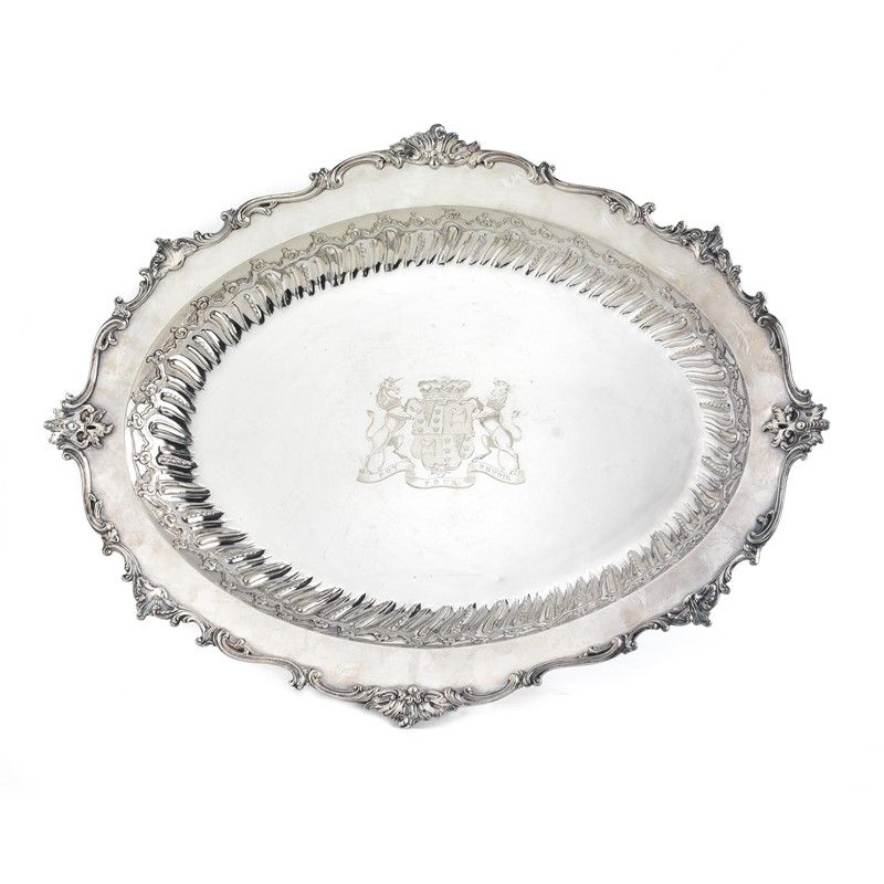 in argento, di forma ovale sagomata con profilo a volute, al centro stemma nobiliare del Duca di Somerset inciso con motto FOY POUR DEVOIR, cm 53x39, g 1915