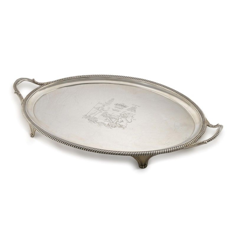 in argento di forma ovale, bordo, anse e piedini con profili baccellati, al centro stemma del Barone Nelson inciso, cm 73x56, g 4350. Reca sul fondo etichetta in carta Collezione Petochi