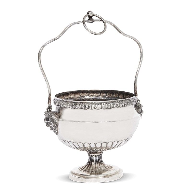 SECCHIELLO PER ACQUASANTA, PROBABILMENTE ROMA INIZI SECOLO XIX in argento, piede circolare con piccolo fusto decorato a unghiature, coppa con parte inferiore baccellate e profilara da foglie d'acanto, due anse a teste virili, presa sagomata, alt. cm 32. g 498