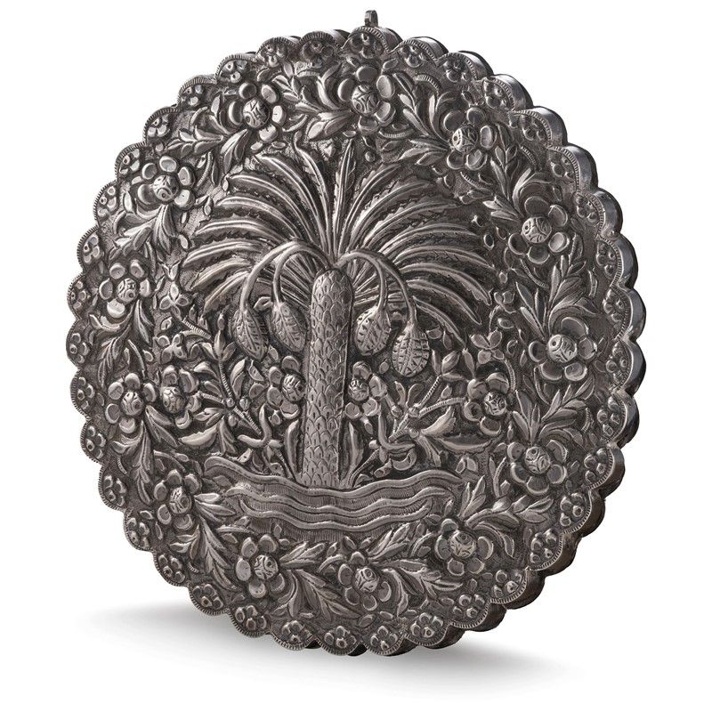 rivestito nella parte posteriore in argento sbalzato a motivi vegetali, diam. cm 25,5, g 1090 lordi