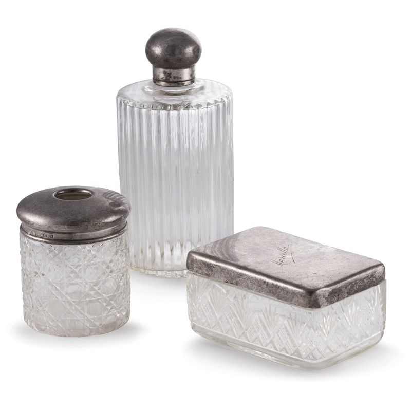 THREE CRYSTAL BOTTLES WITH SILVER CAPS