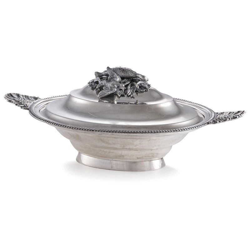 in argento di forma ovale con due anse a foglia, coperchio con presa in foggia di cacciagione, cm 39x23,5, g 1650