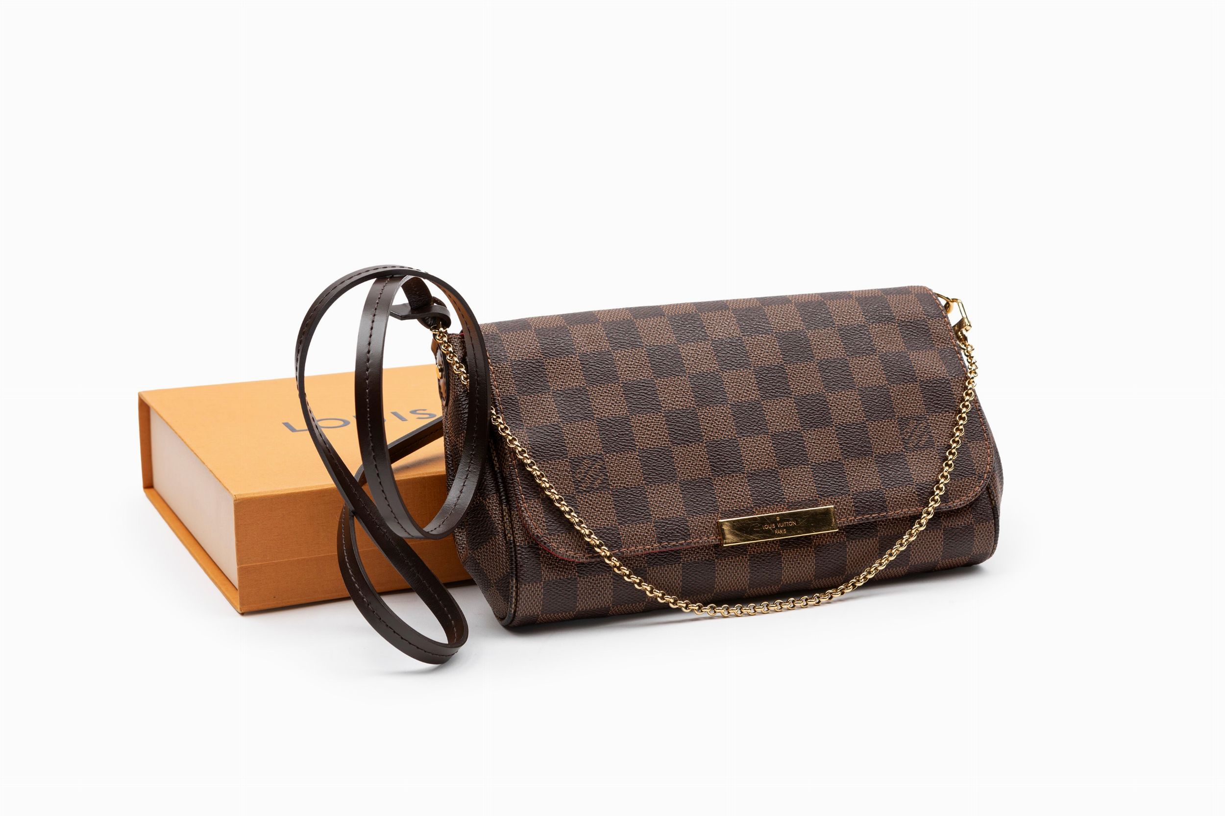 in pelle Damier Ebène con doppia tracolla in pelle e metallo dorato, cm 24, con sacchetto e scatola (lievissimi difetti)