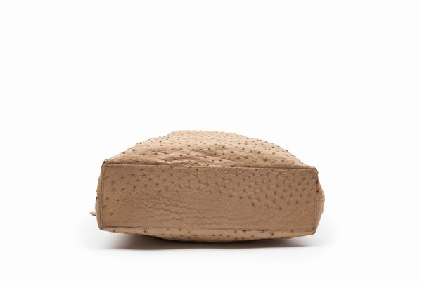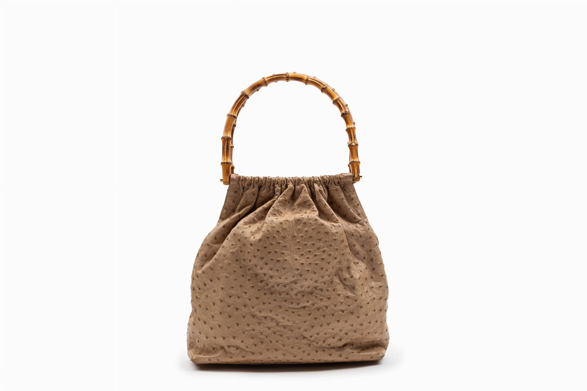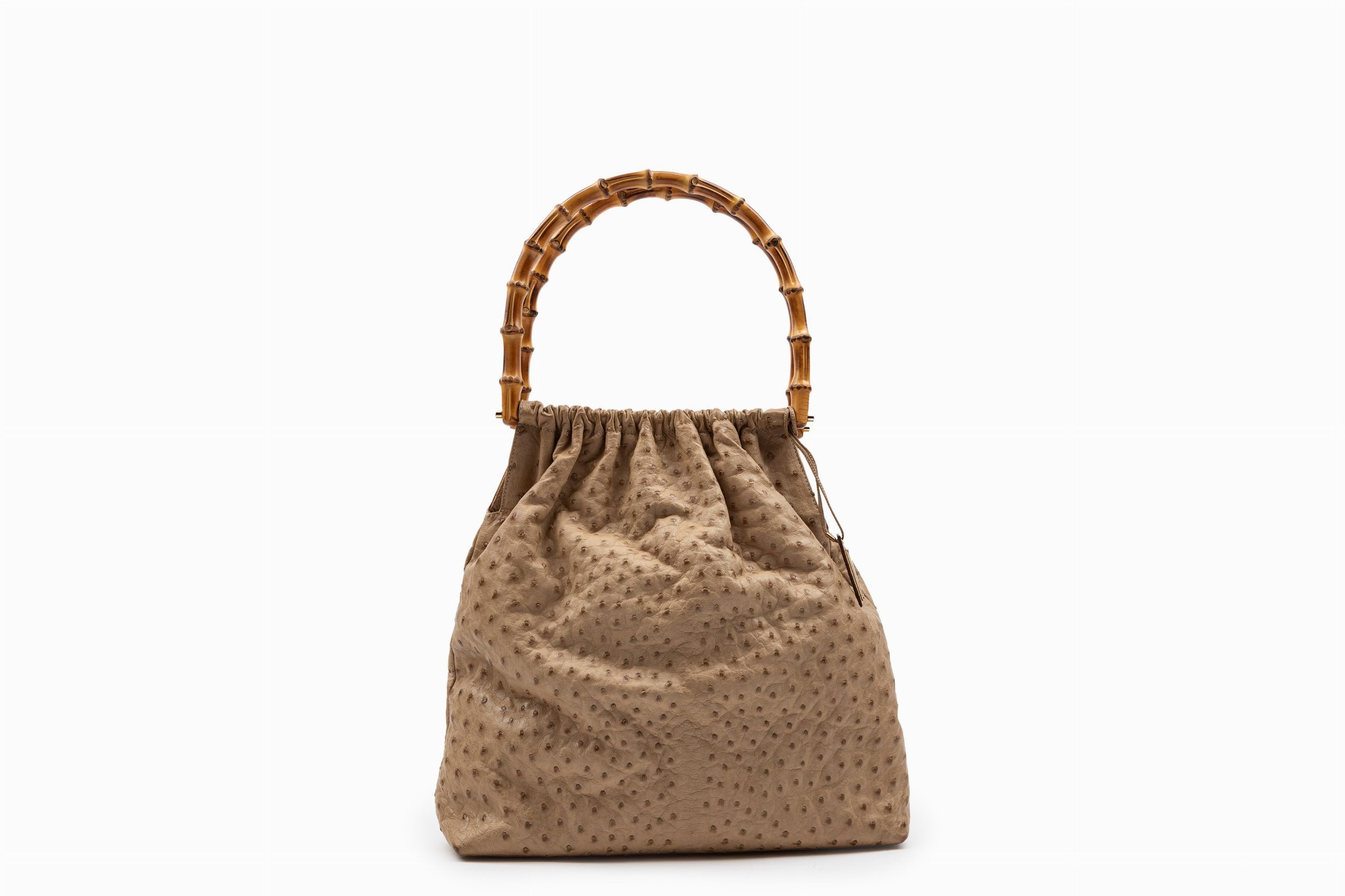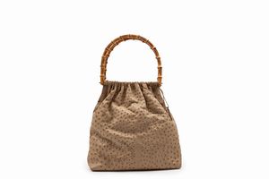 in pelle di struzzo color beige, manici in bambù, cm 32, con sacchetto (lievi difetti)