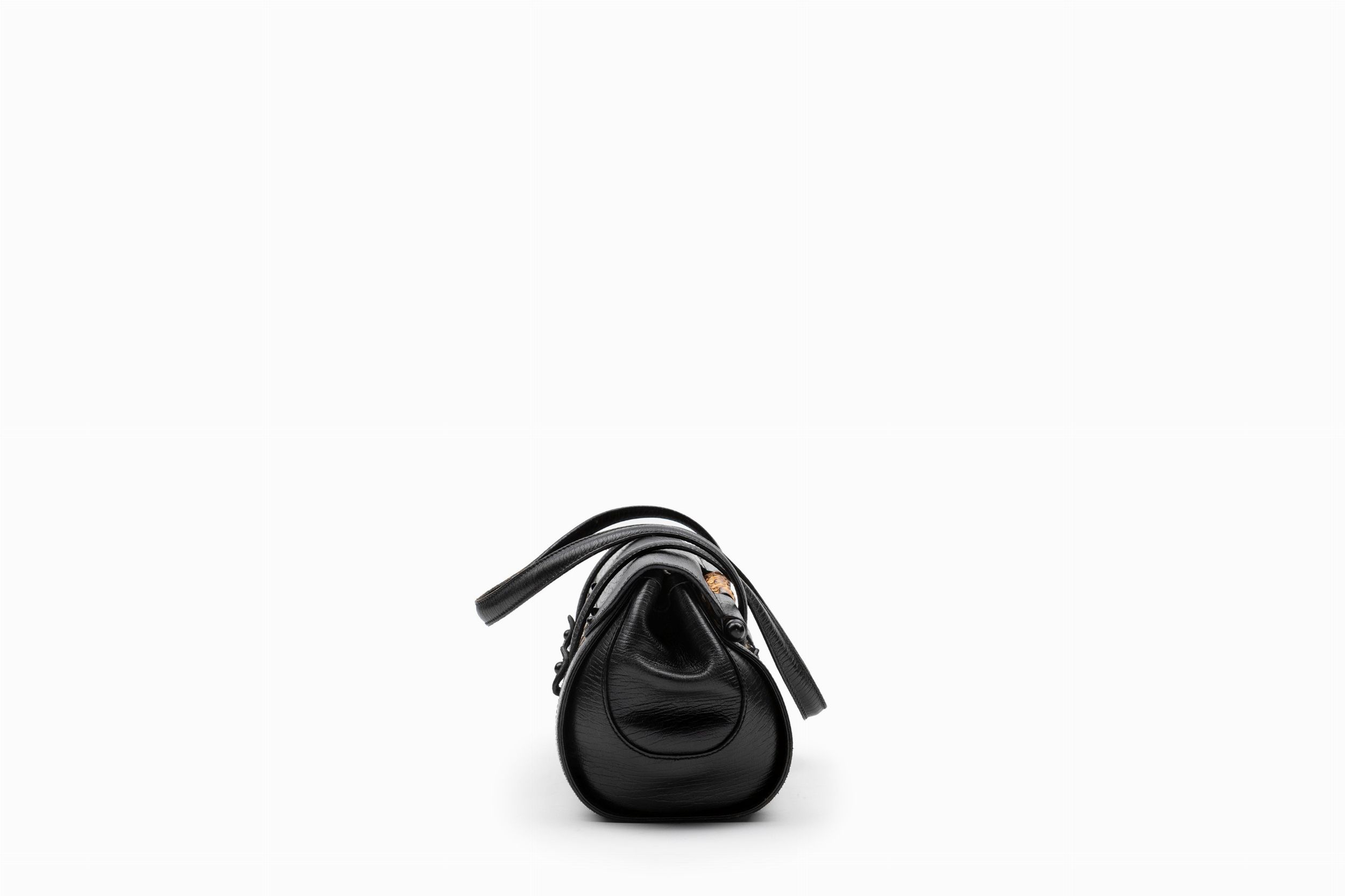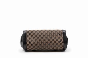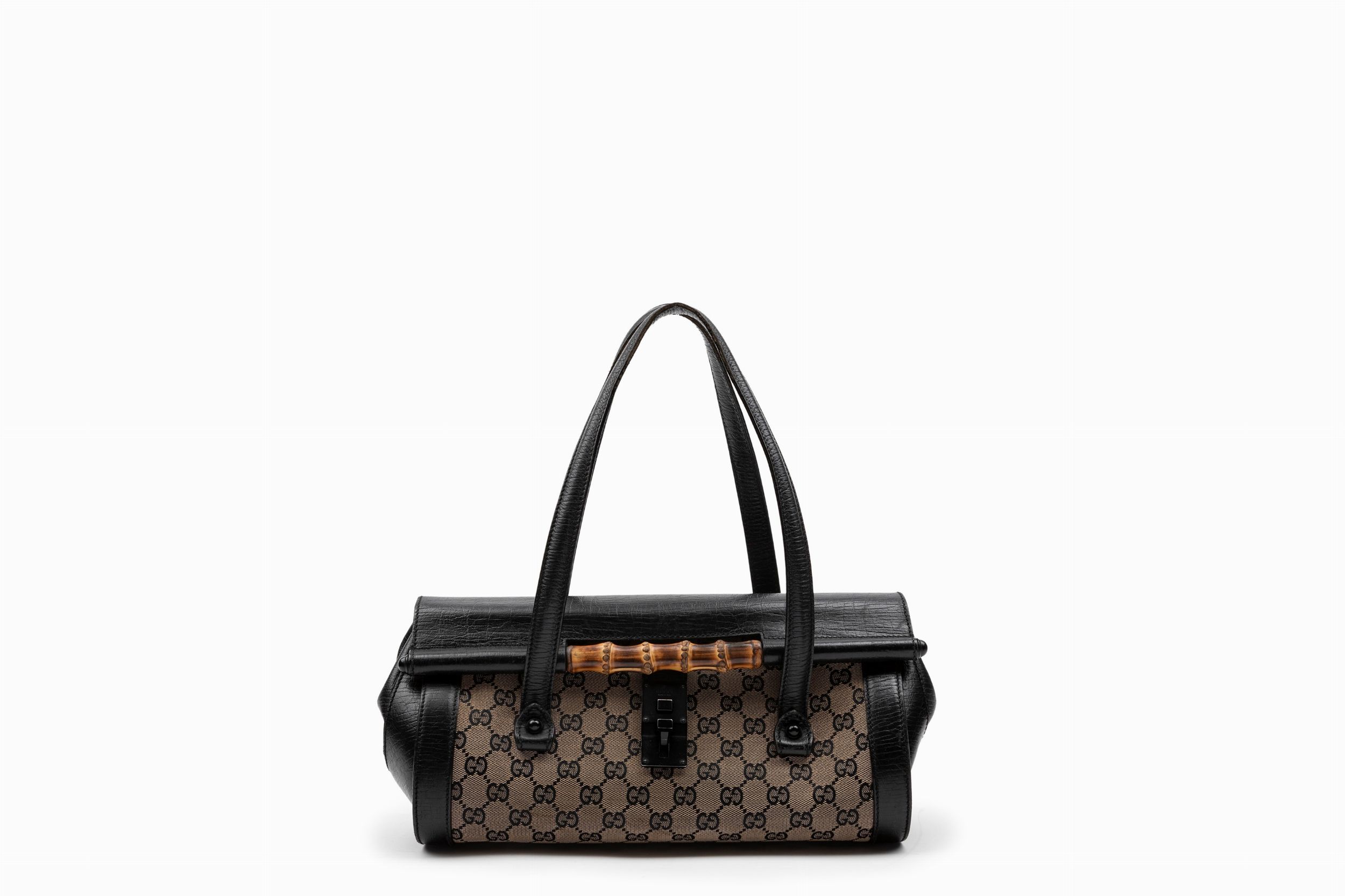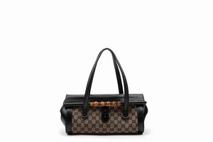 in tela GG bicolore, profili e doppi manici in pelle color nero, dettaglio in bambù, cm 32 (lievi difetti)
