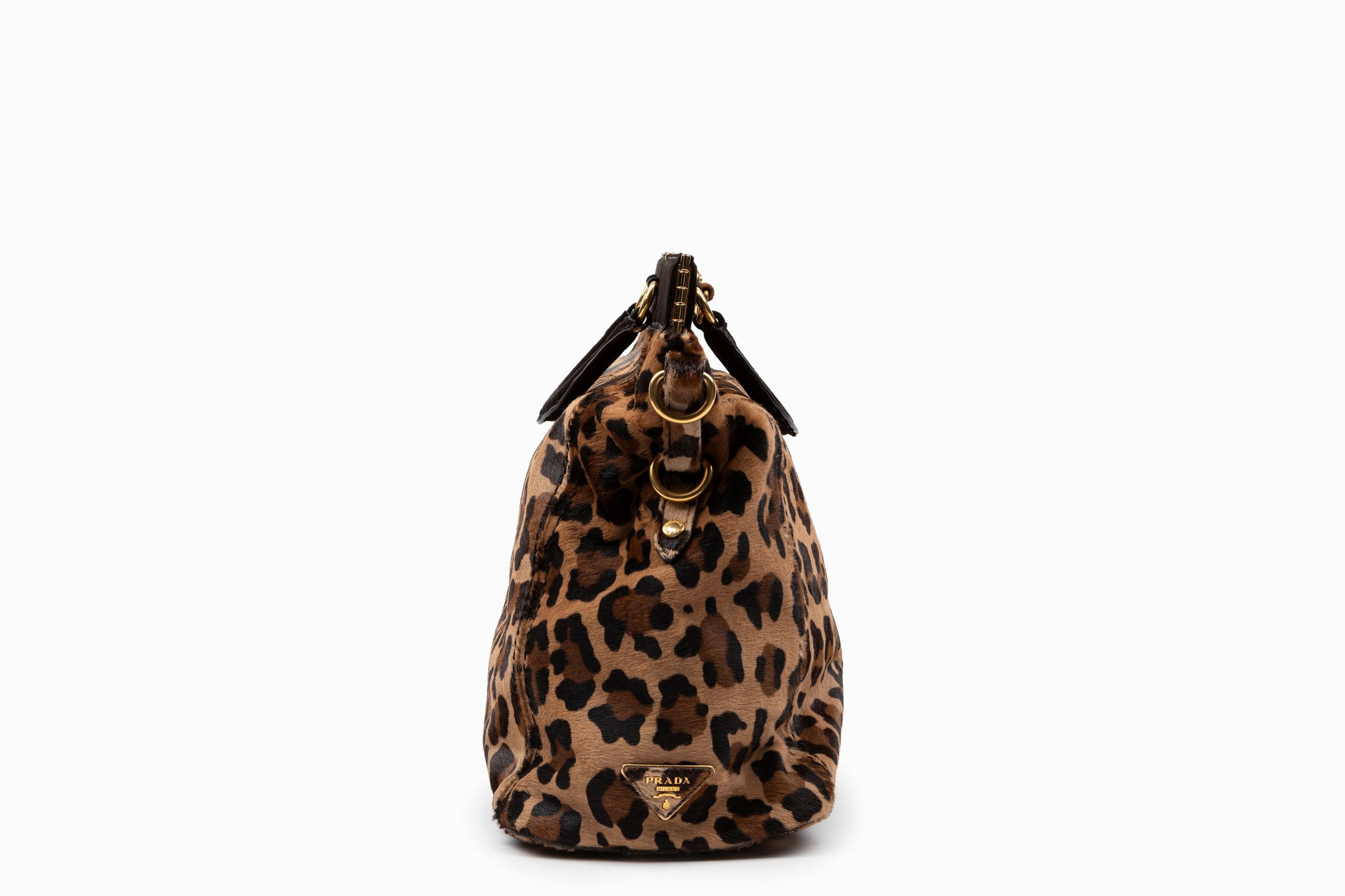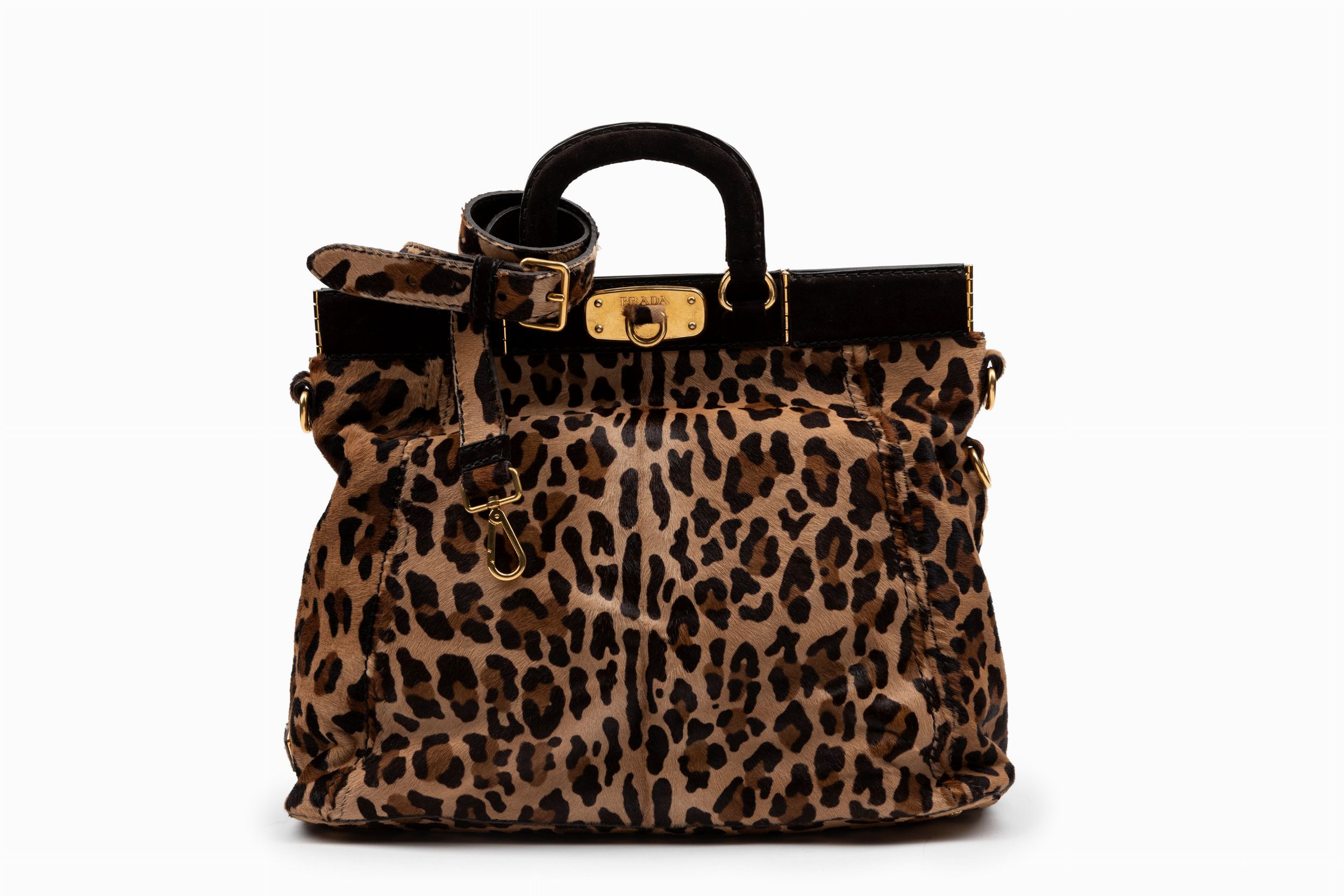 in cavallino stampa maculata, doppi manici e profili in camoscio color nero, dettagli in metallo dorato, tracolla staccabile, cm 40 (difetti)
