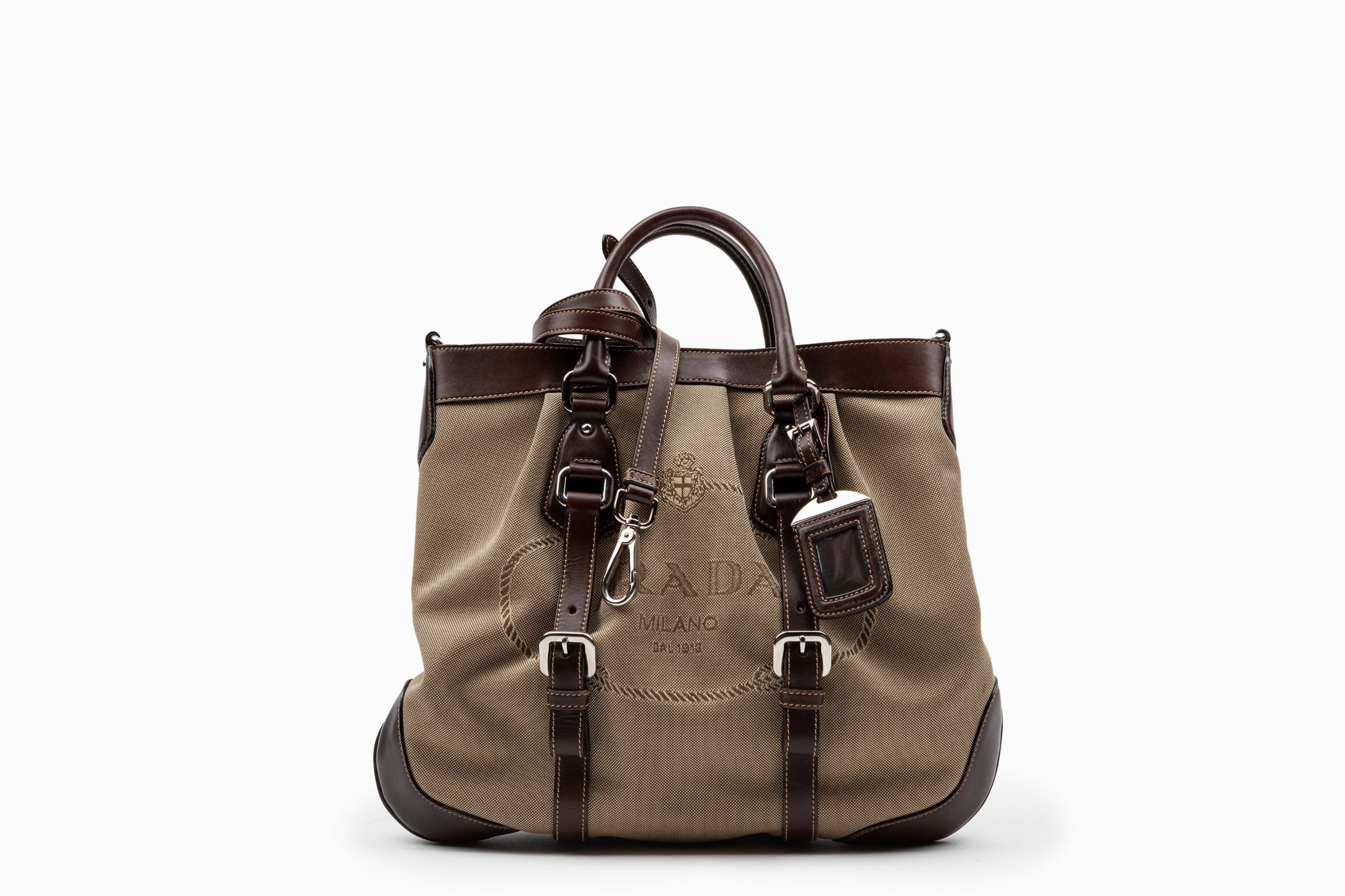 in tela color kaki, profili e doppi manici in pelle color marrone, tracolla staccabile, cm 30 (difetti)