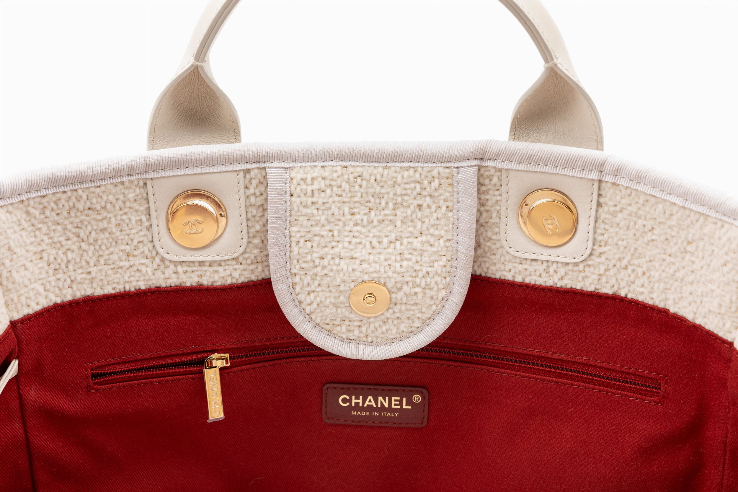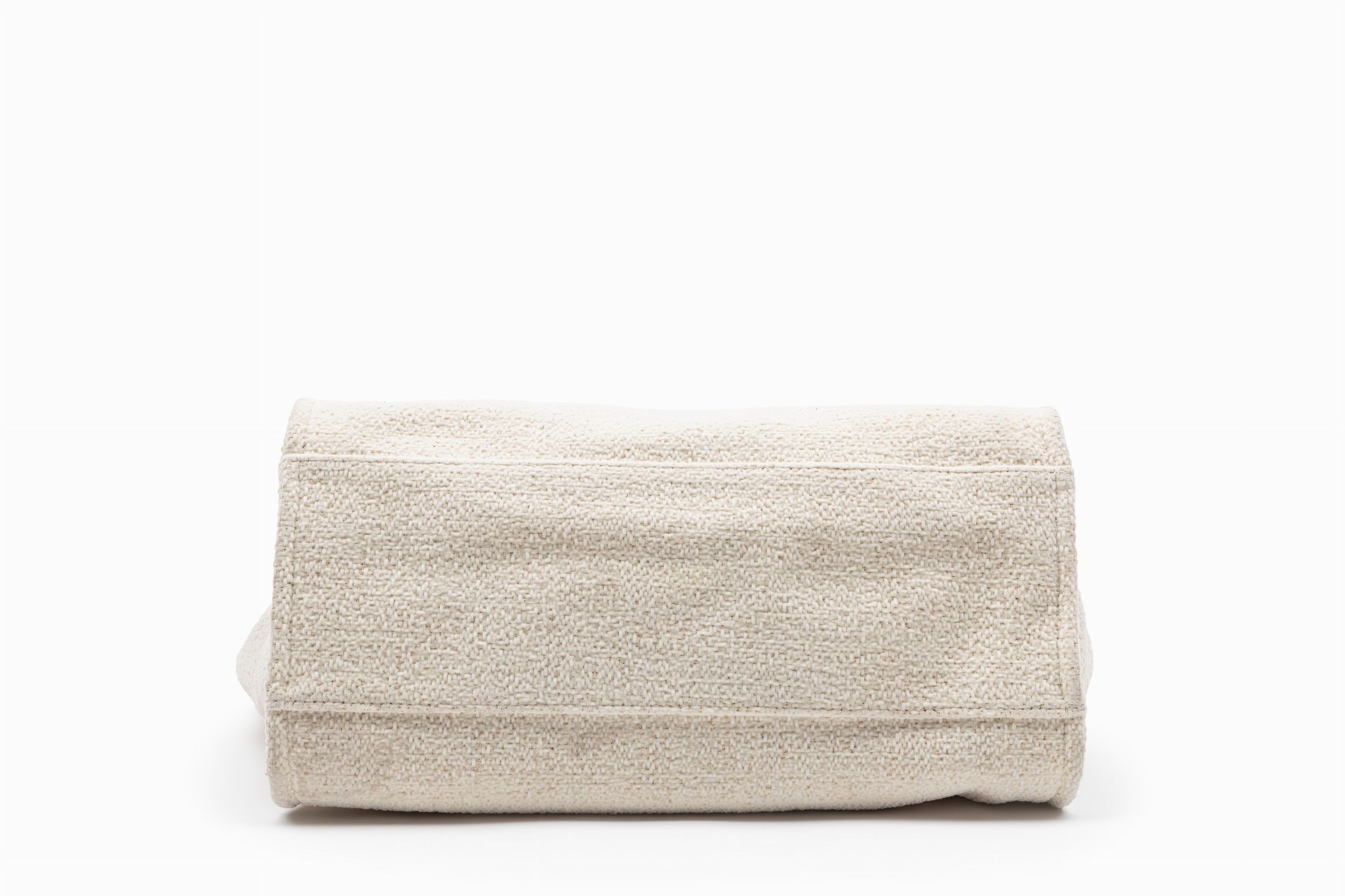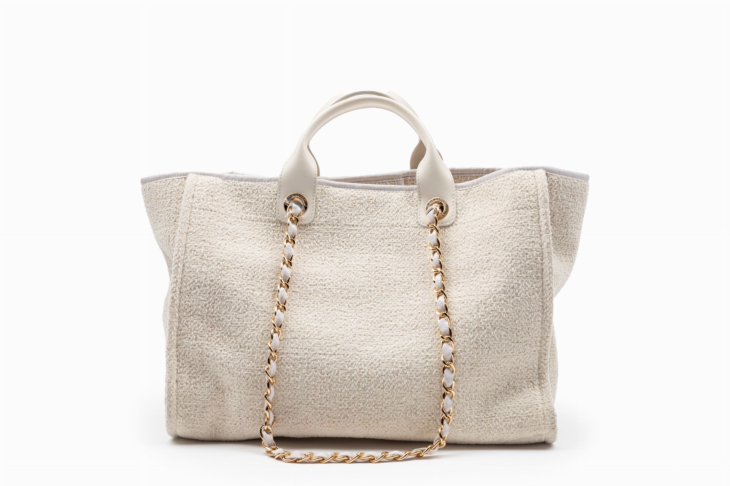 2019 in tessuto color burro, manici in pelle, tracolla a catena, dettagli in metallo dorato, cm 40 (lievi difetti)