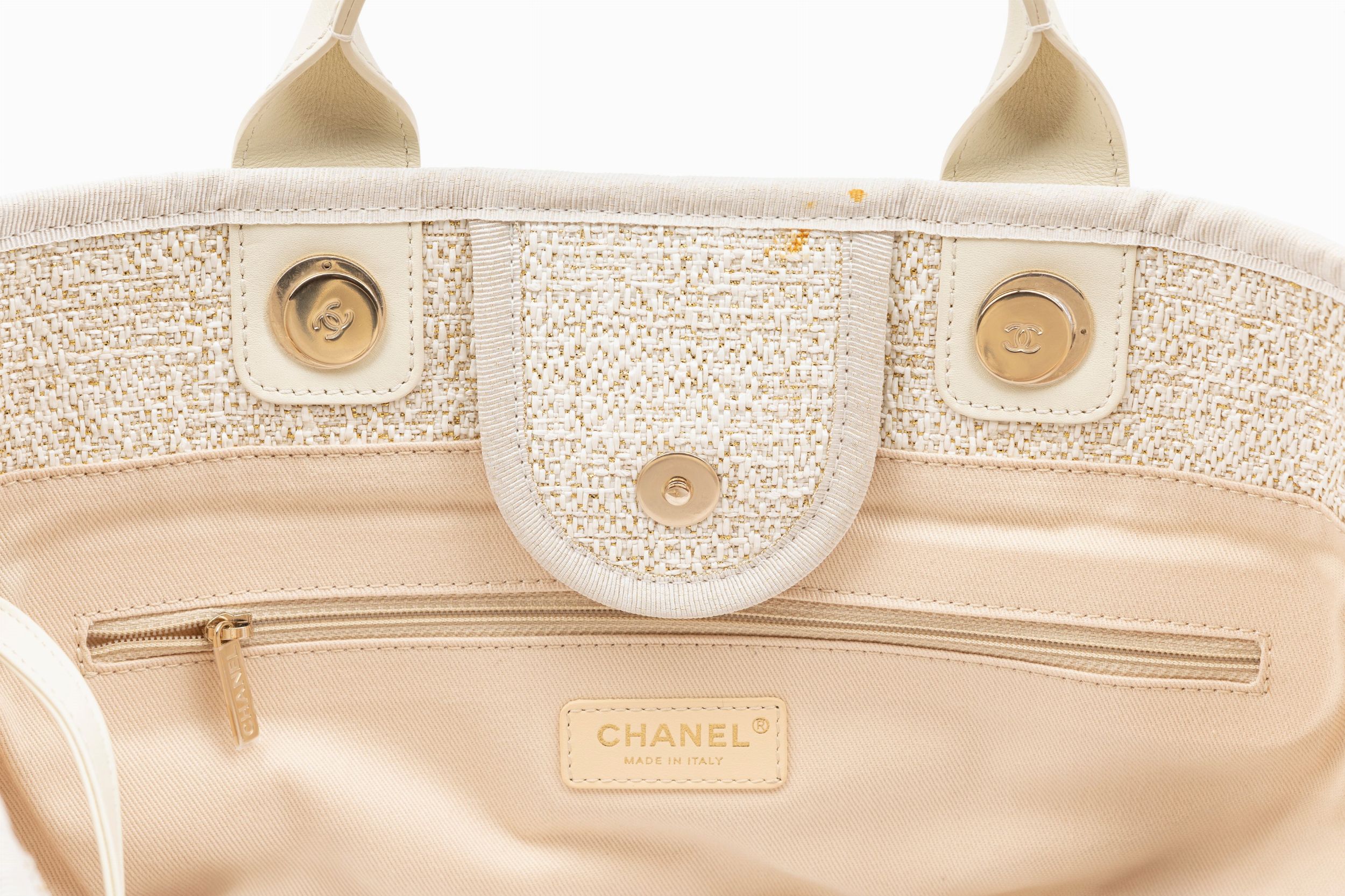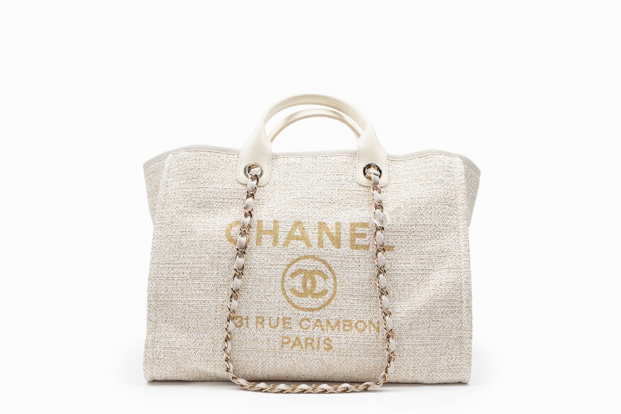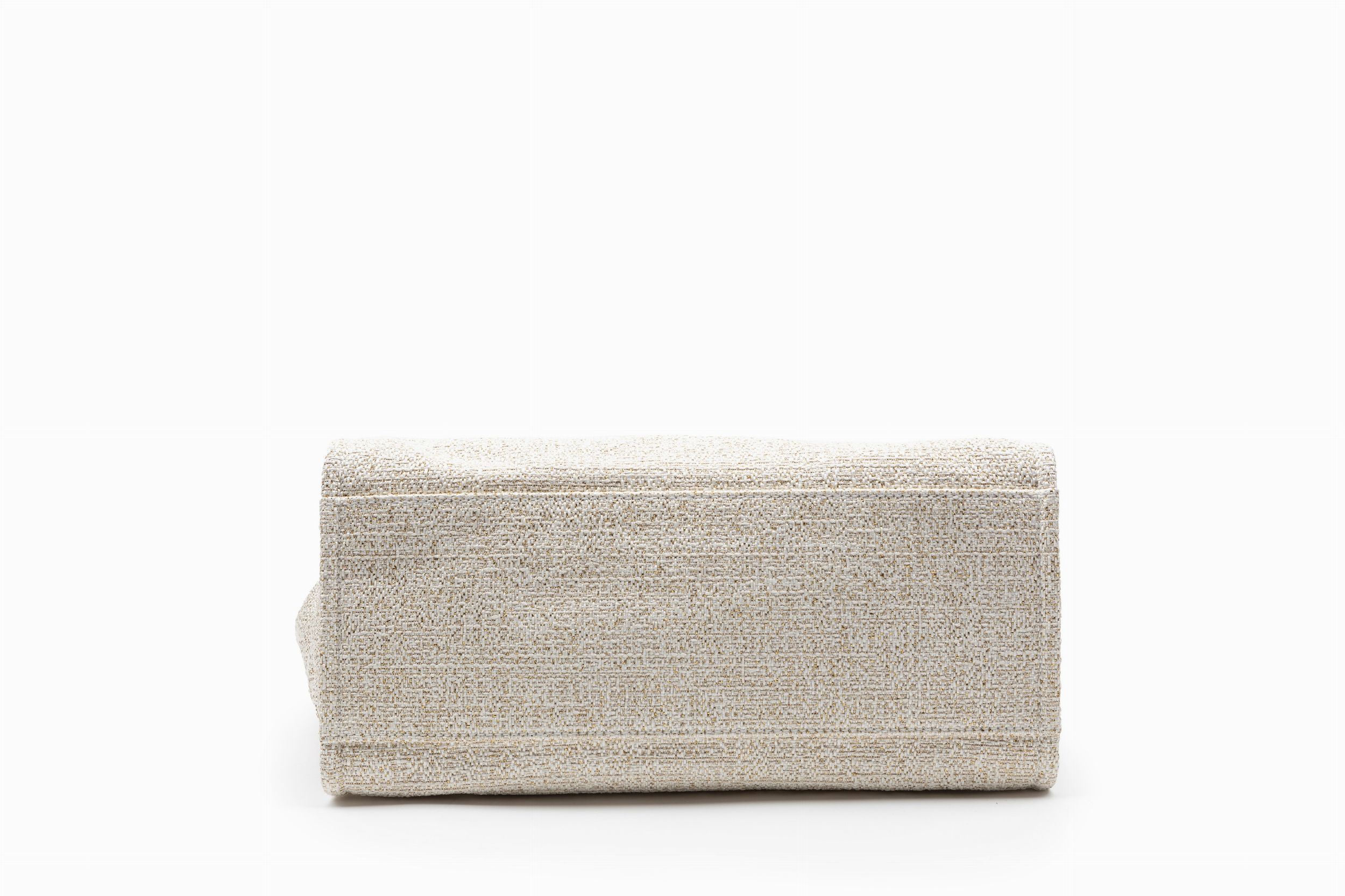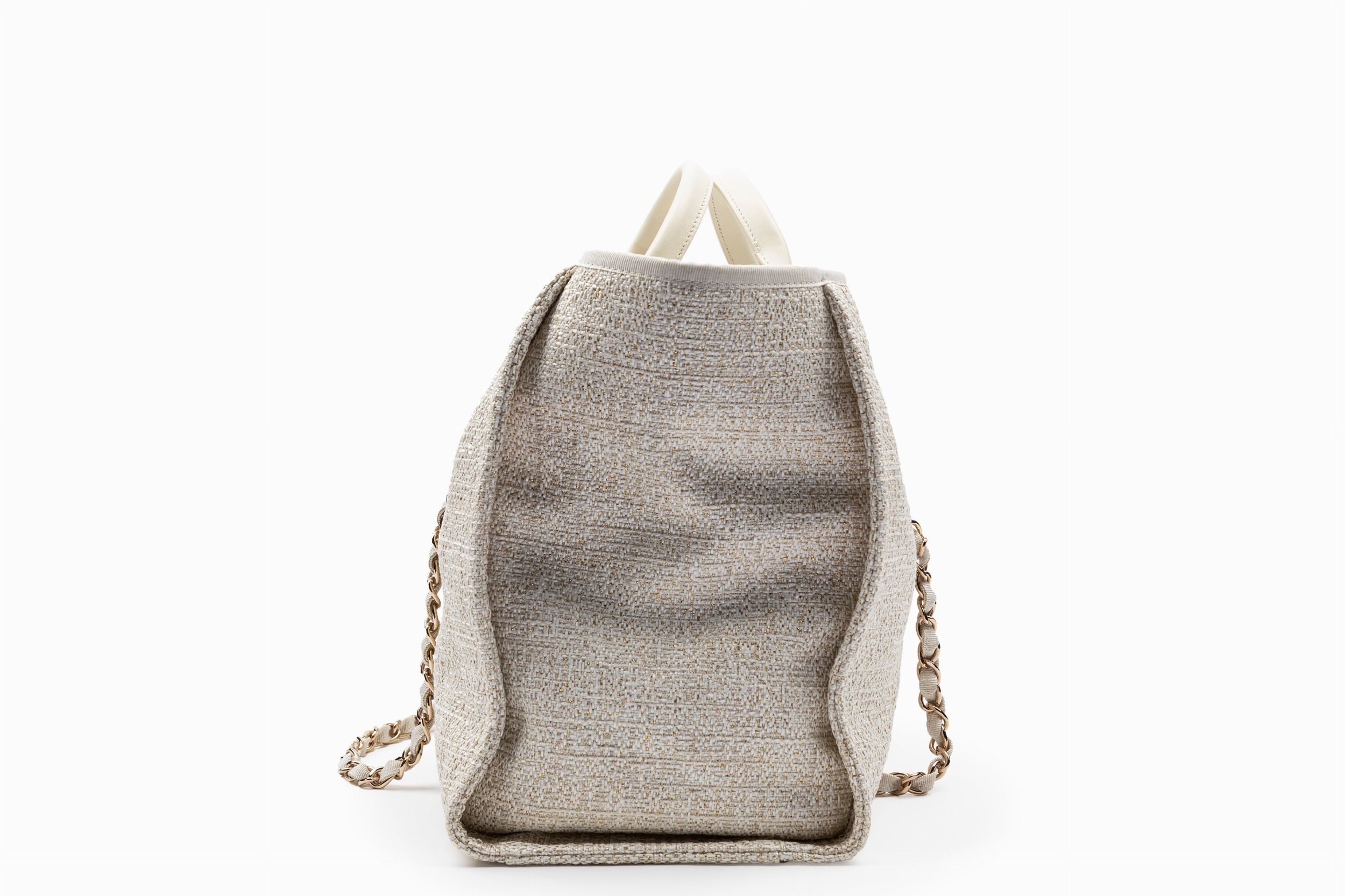 2019 in tessuto melange color panna metallizzato, doppi manici in pelle e tracolla a catena, dettagli in metallo dorato, cm 40, con sacchetto (lievi difetti)