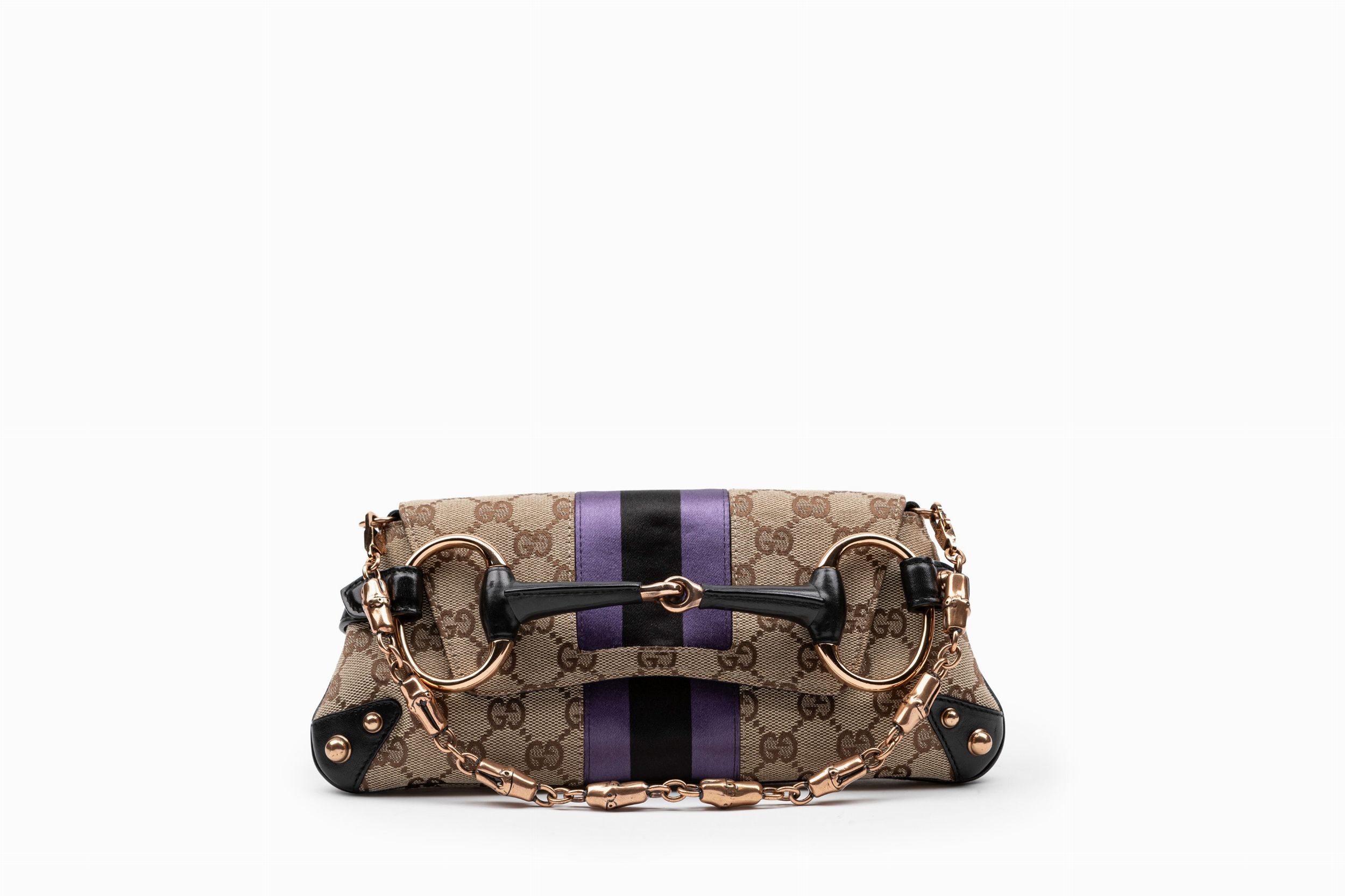 in tela logata GG, banda in raso color viola e nero, tracolla in metallo con elementi a forma di bambù staccabile, cm 26, con sacchetto