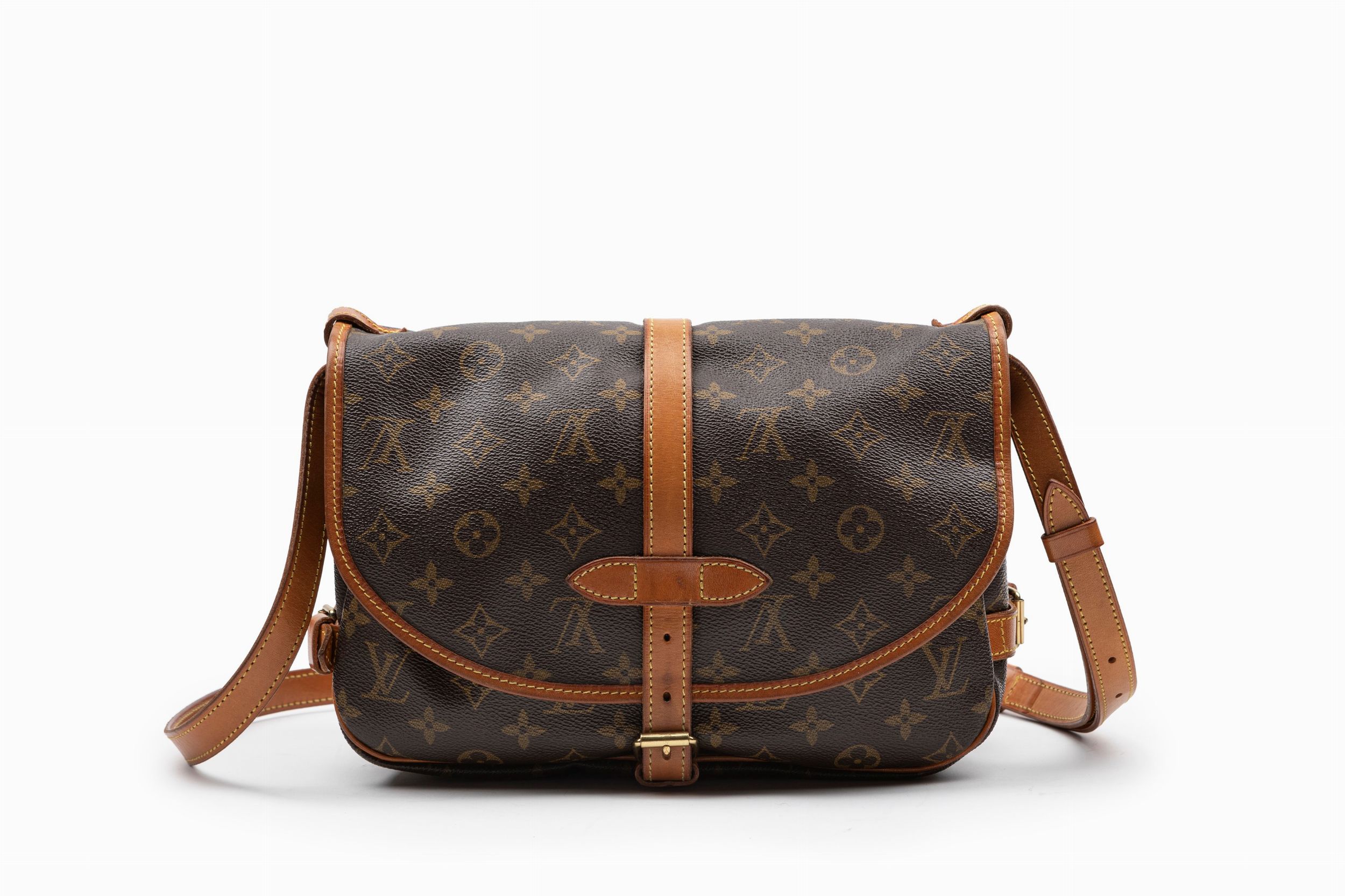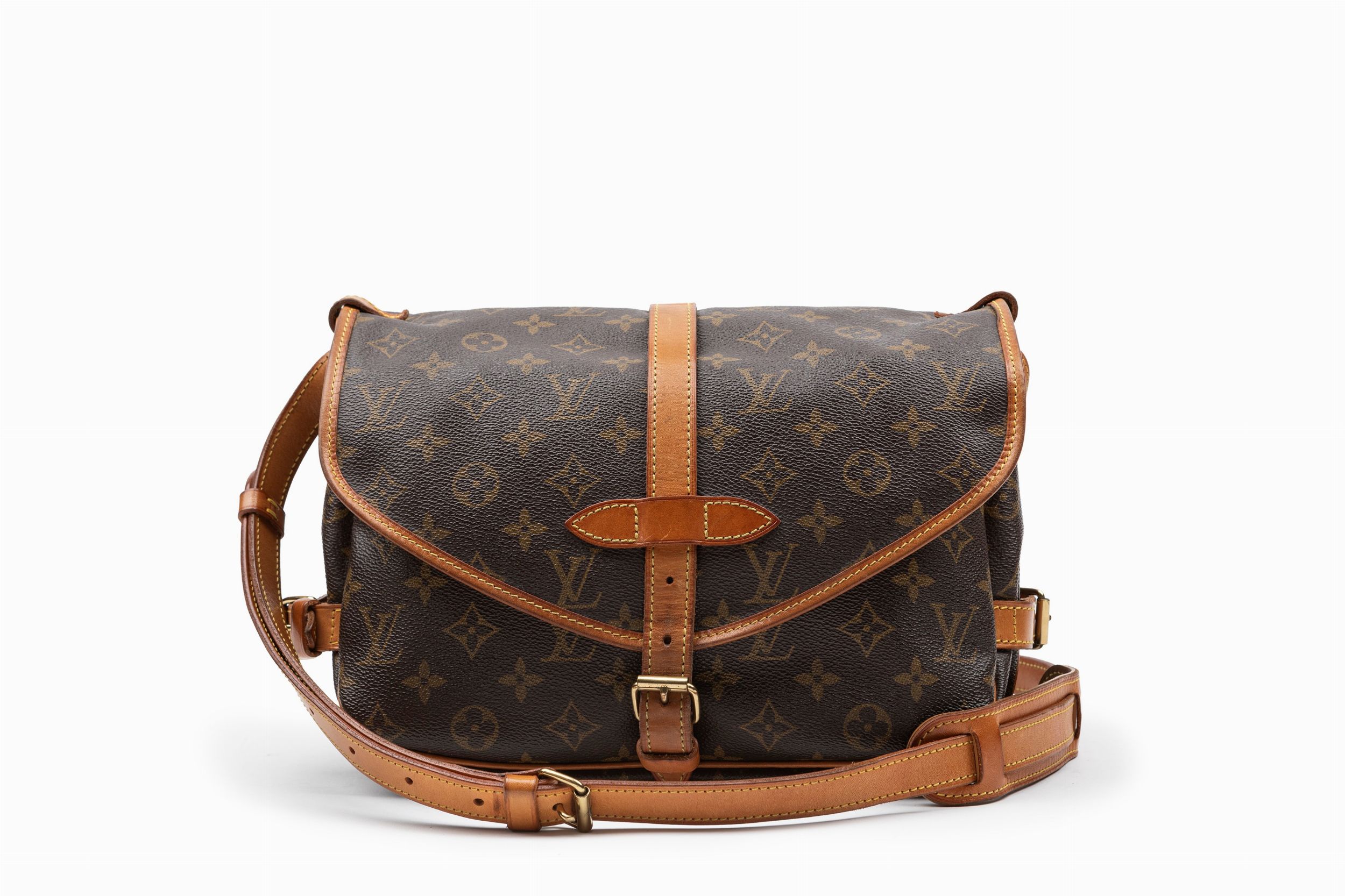 in tela monogram a doppio scomparto, tracolla regolabile, cm 28 (lievi difetti)