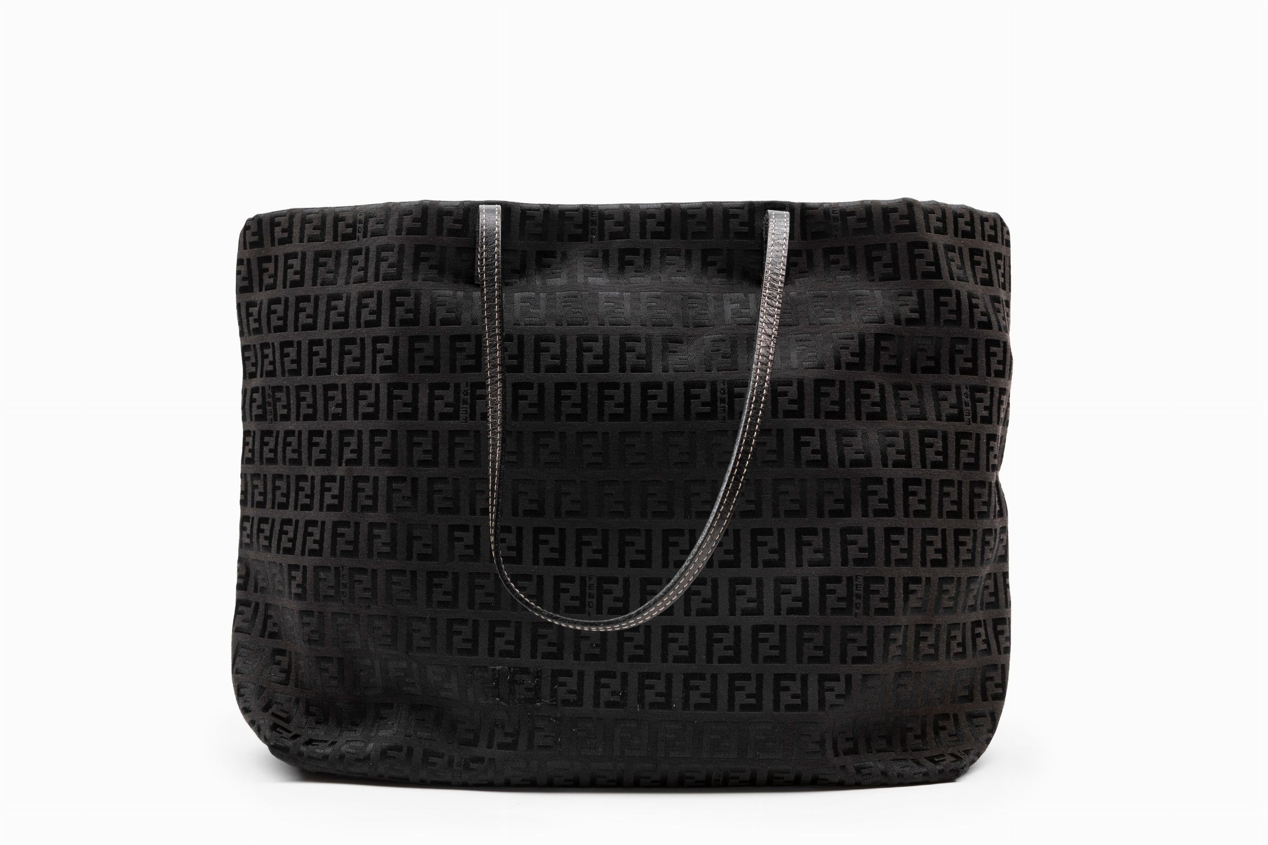 in tessuto logato color nero, manici in pelle, cm 32, con sacchetto (lievi difetti)
