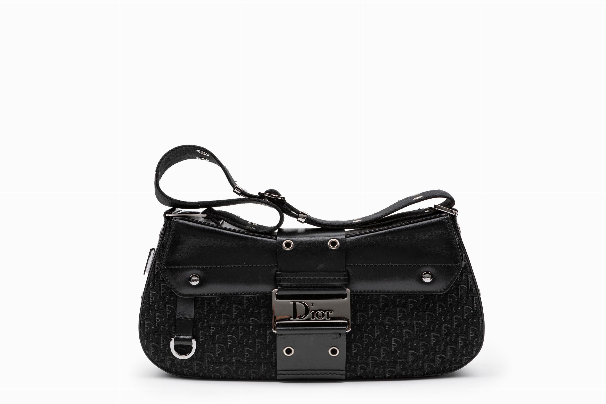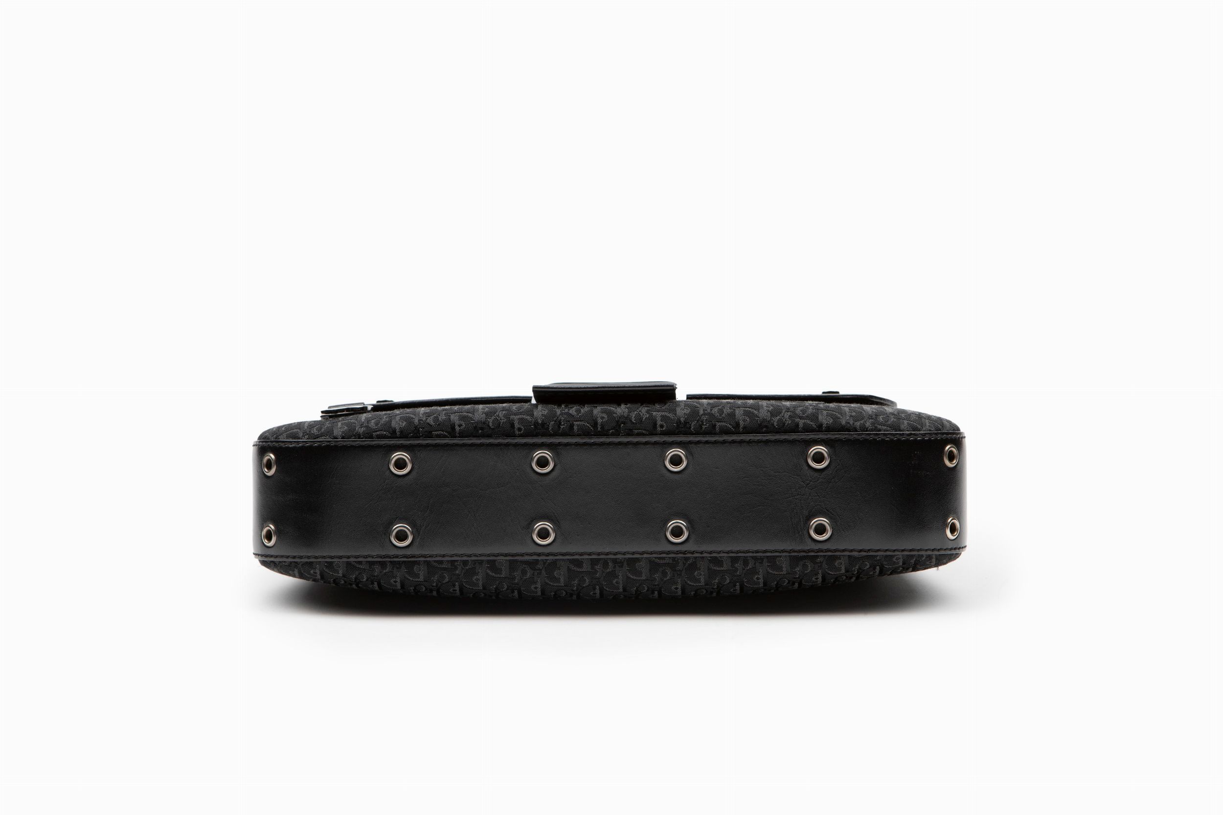 in tessuto nero logato, tracolla regolabile, dettagli in metallo, cm 30, con sacchetto (lievissimi difetti)