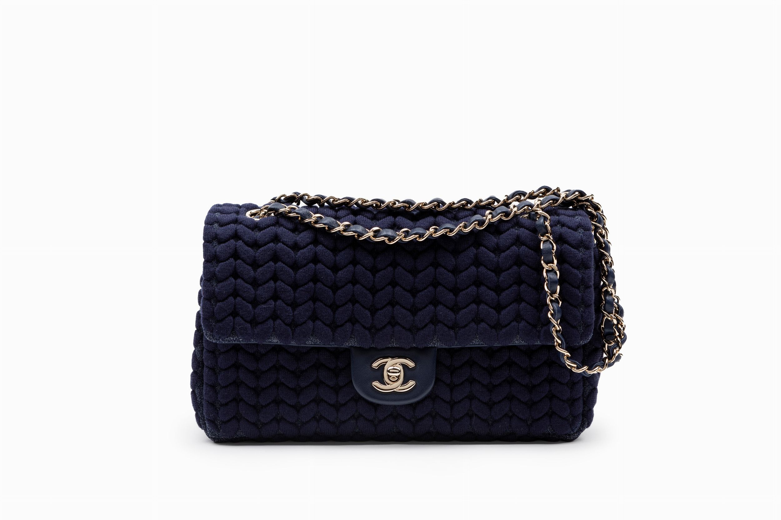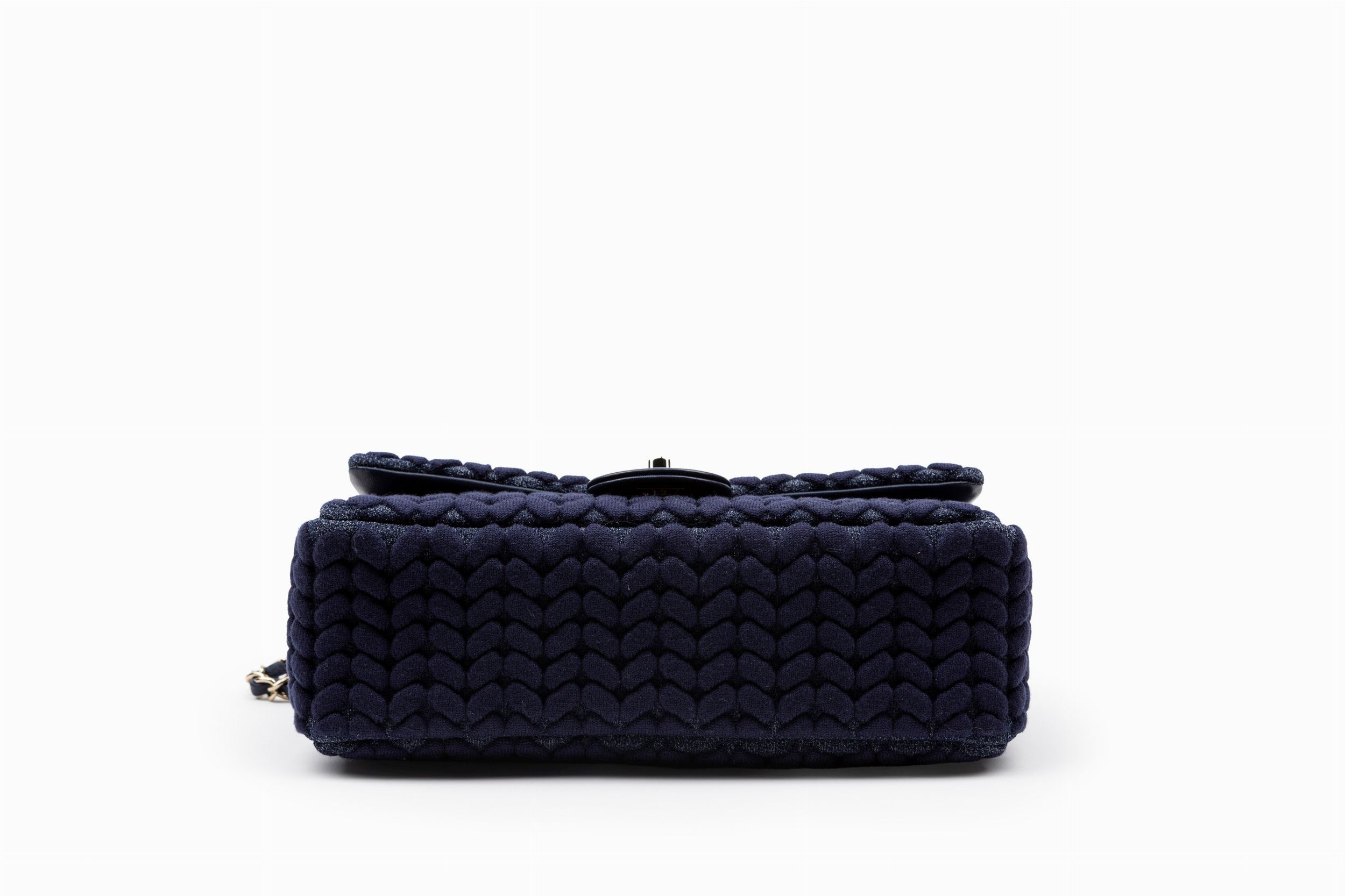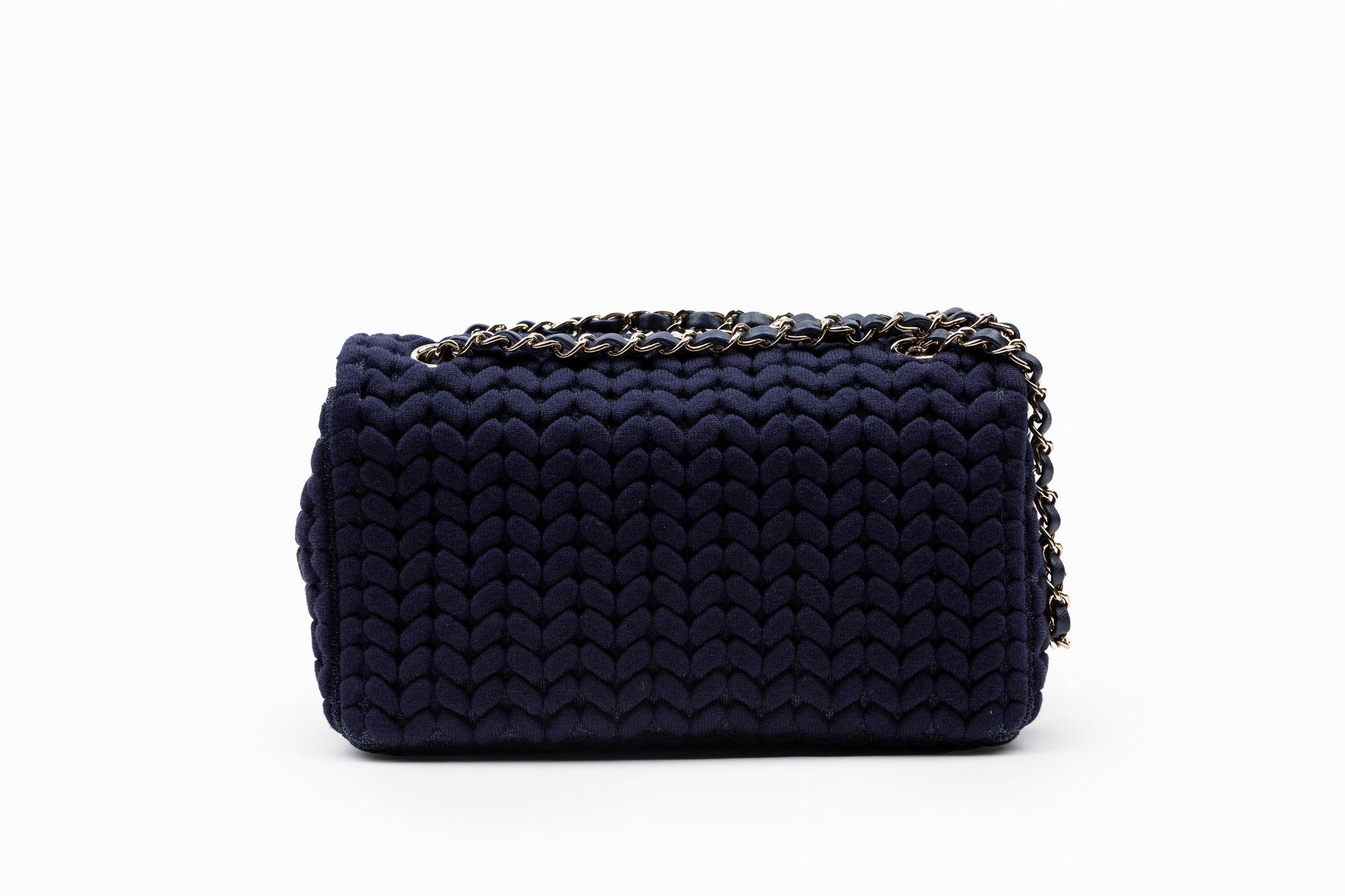 2019 in tessuto intrecciato color blu navy, tracolla e catena in metallo dorato, dettagli in pelle, cm 25, con scatola