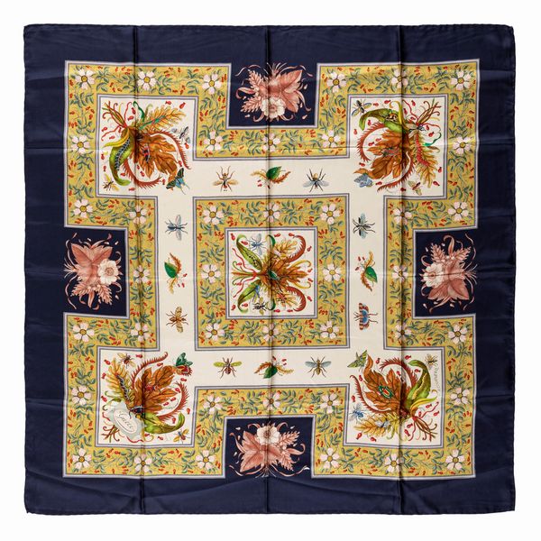 in seta, stampa insetti e fiori, bordo color blu, V. Accornero (difetti)