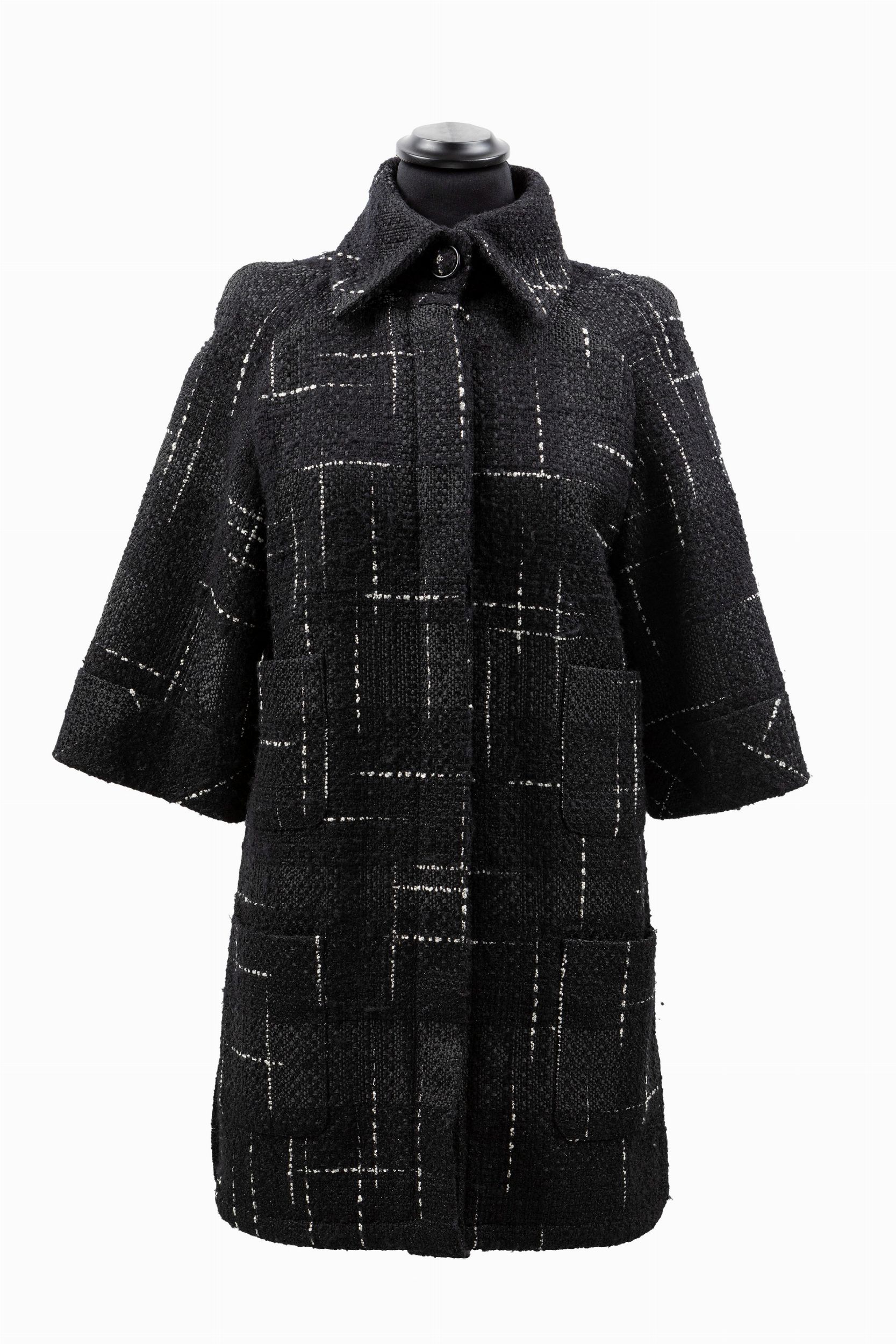 con manica al gomito, misto lana bouclé nero e bianco, fodera in seta, bottoni logati, taglia 34 francese, con custodia