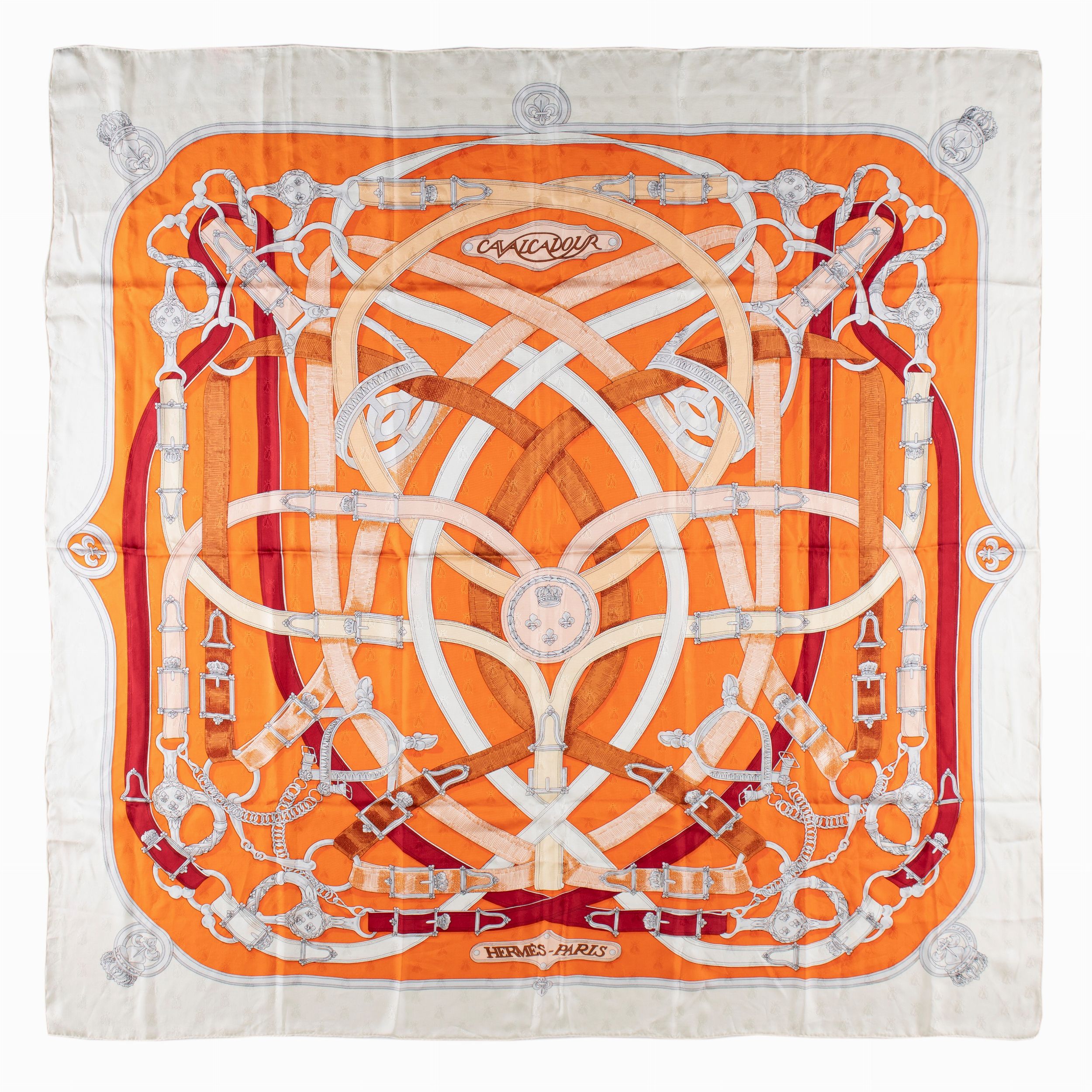 1982 in seta su fondo color arancio, bordo color panna, Henri d'Origny, cm 130 x 130 (lievissimi difetti)
