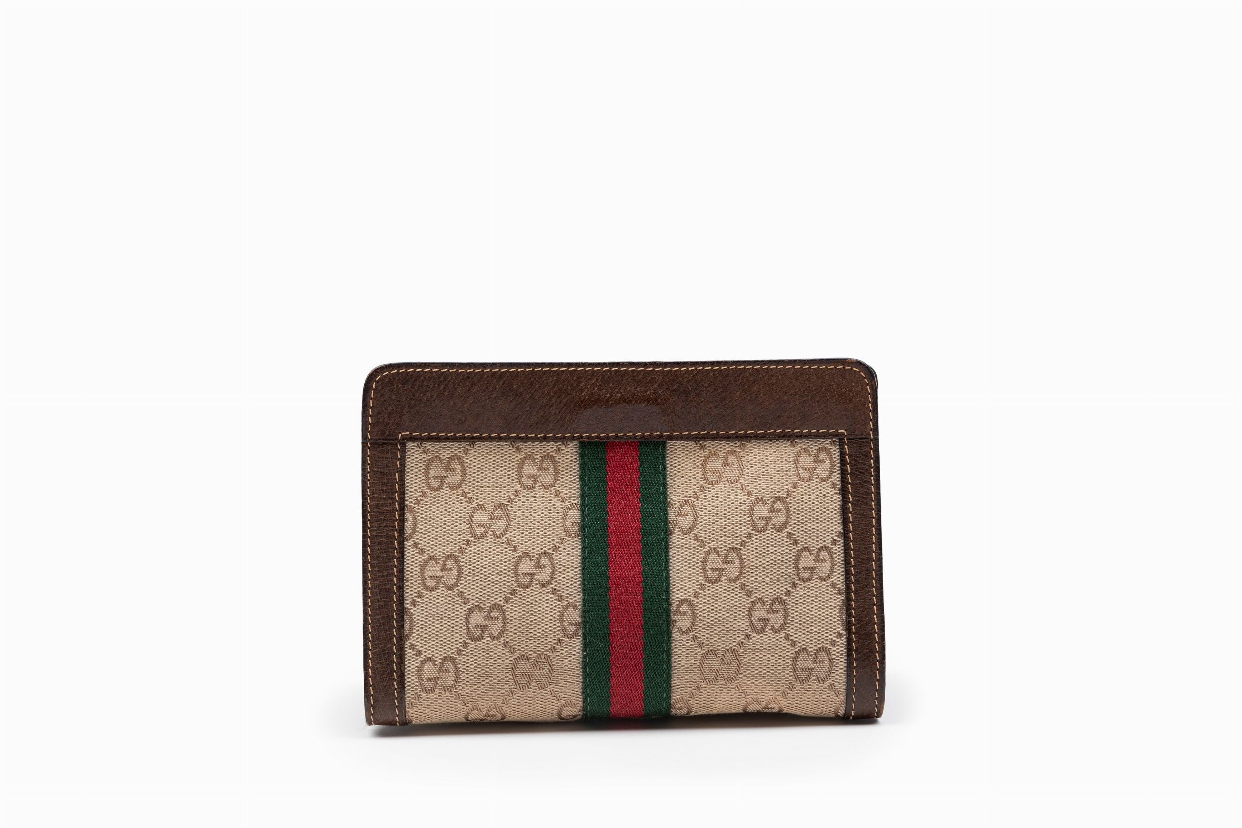 in tela logata GG, banda web rossa e verde, profili in pelle di cinghiale, cm 18, con sacchetto (difetti)