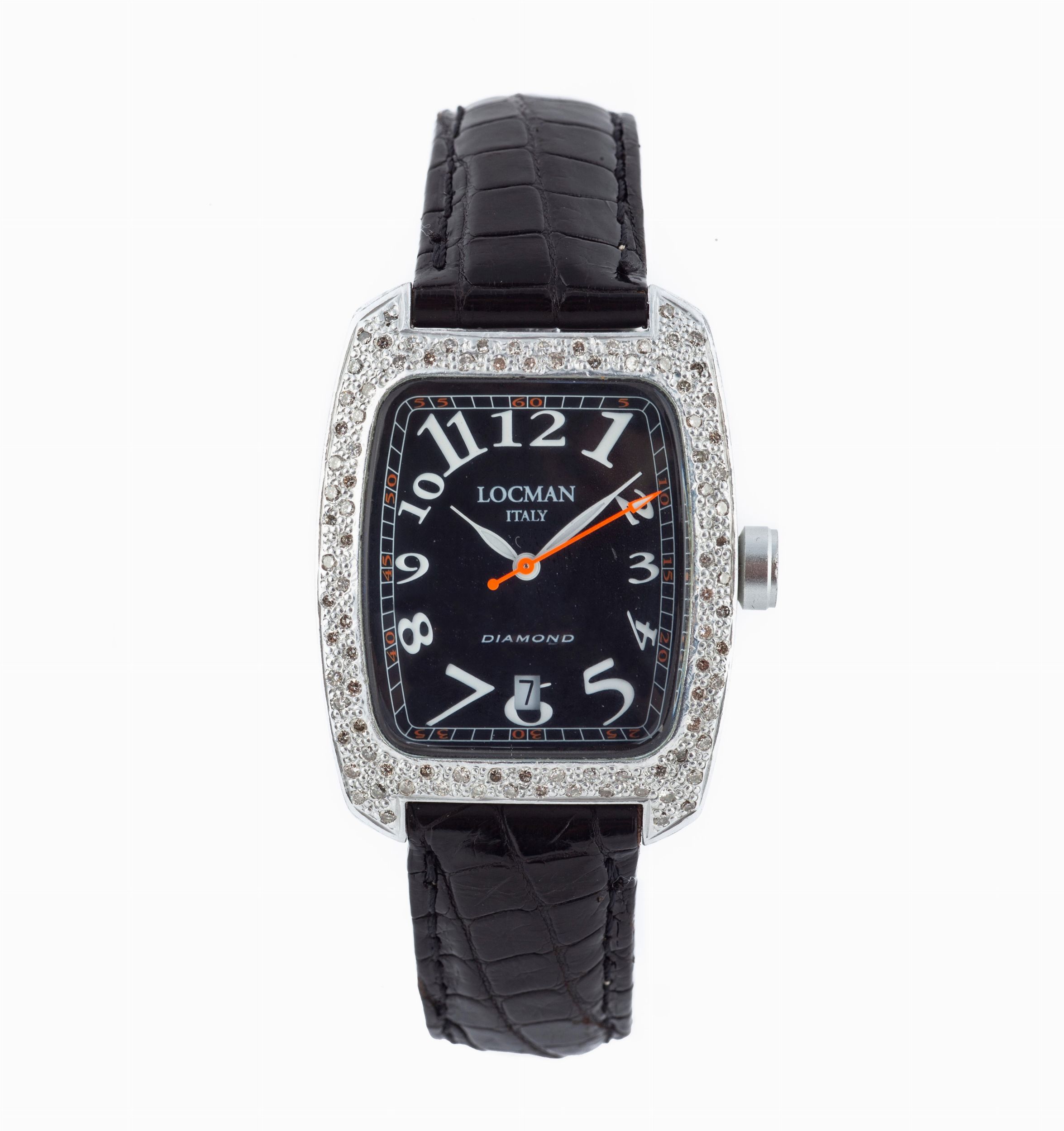 Alluminio e brillanti. Cassa n° 3436, ref 488, fondello con viti, cinturino con fibbia originale. Quadrante nero, numeri arabi, data, lancette a foglia, secondi al centro. Movimento al quarzo.