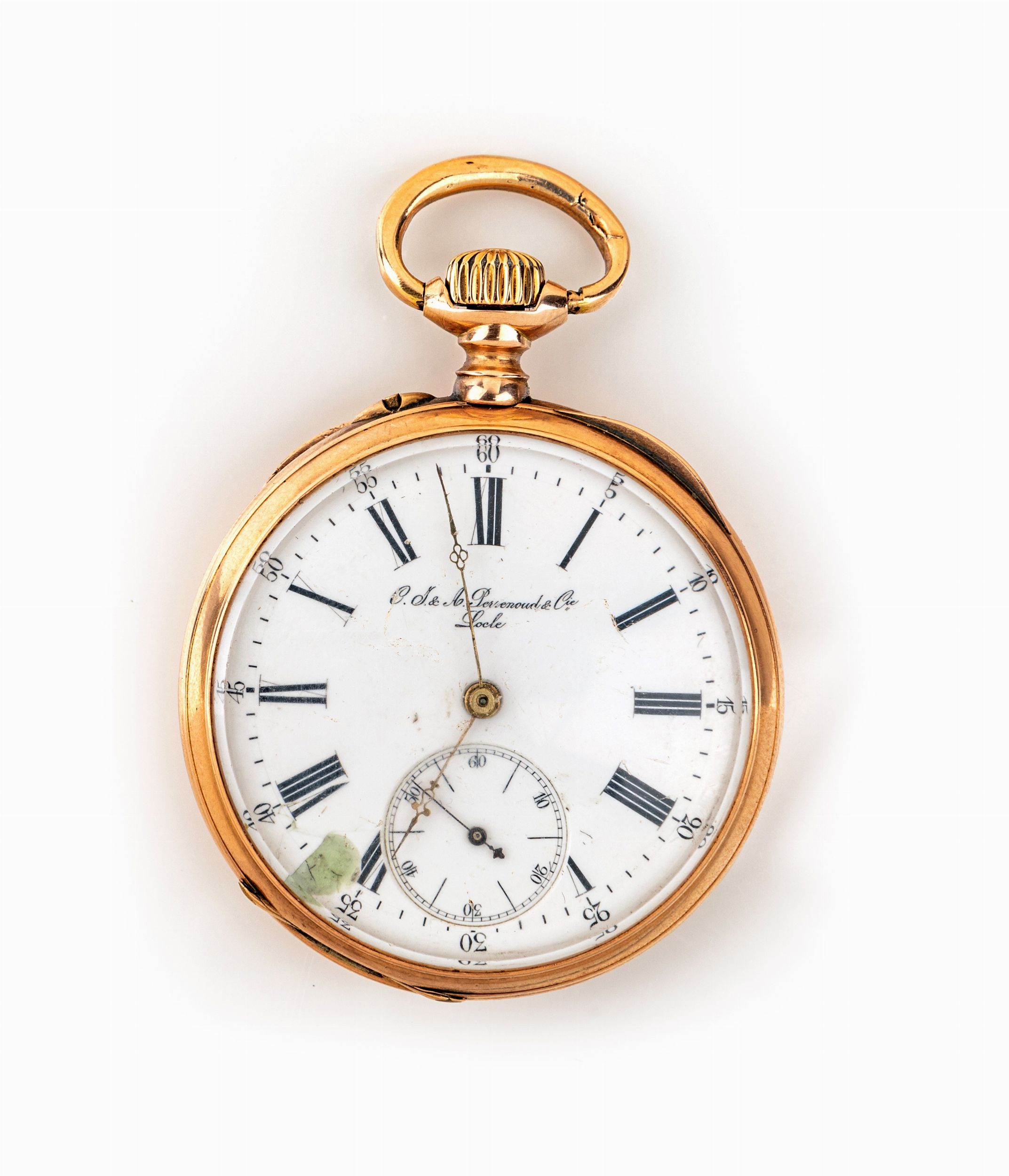Primi '900 Oro giallo 585/000. Remontoir, cassa a 4 corpi n° 36796, cuvette con dedica incisa, fondello a guilloche con monogramma. Quadrante a smalto bianco, filè, numeri romani, secondi in basso, lancette a fantasia. Movimento con scappamento ad ancora, bilanciere bimetalico con viti, spirale Breguet. Difetti alla carica. Da revisionare