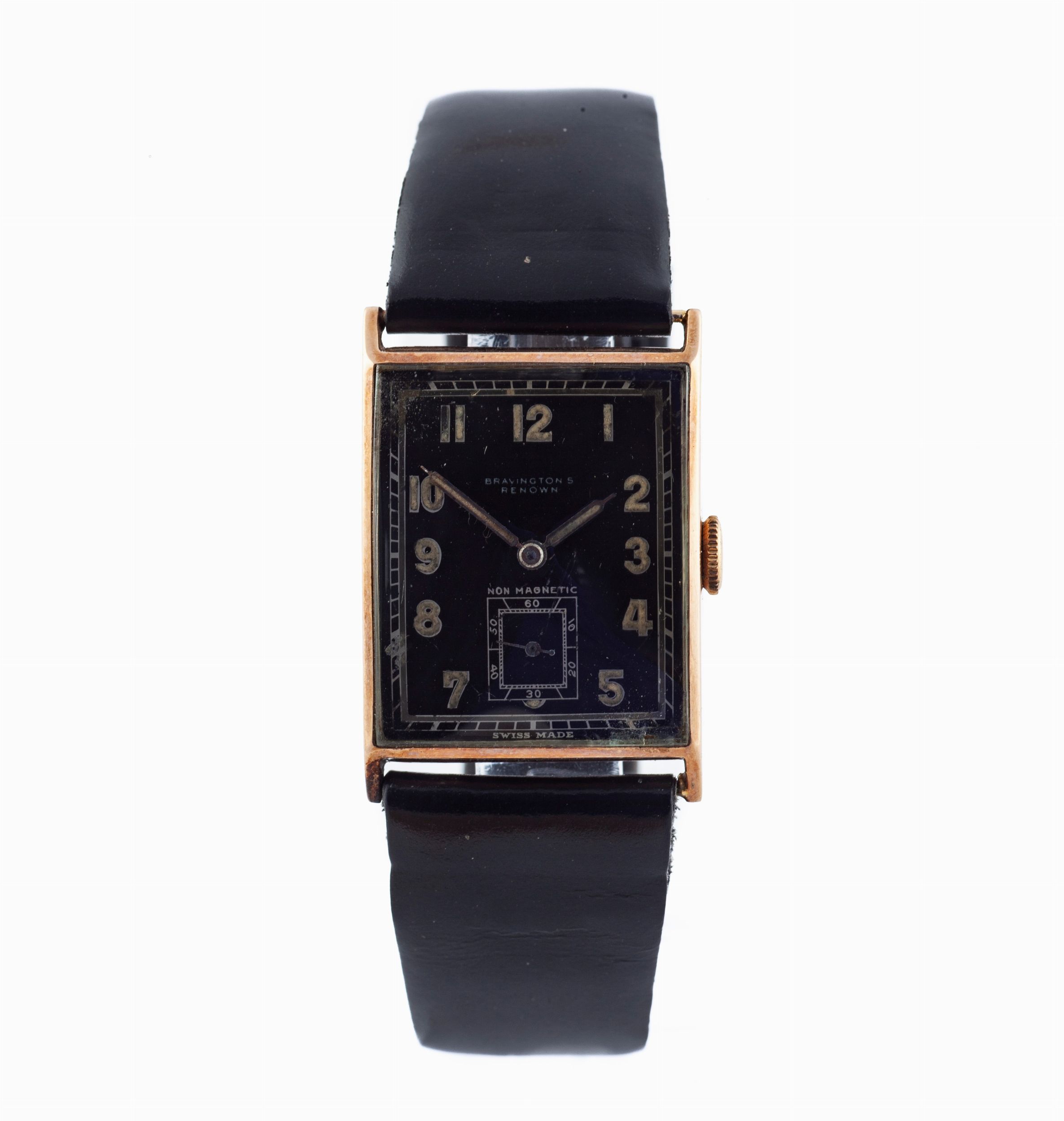 Anni '30 Oro giallo 375/000,Cassa BWC London, NE51, fondello a cerniera. Quadrante nero, numeri arabi fosforescenti, secondi in basso, lancette index. Movimento manuale, bilanciee monometalico con viti, spirale piana.