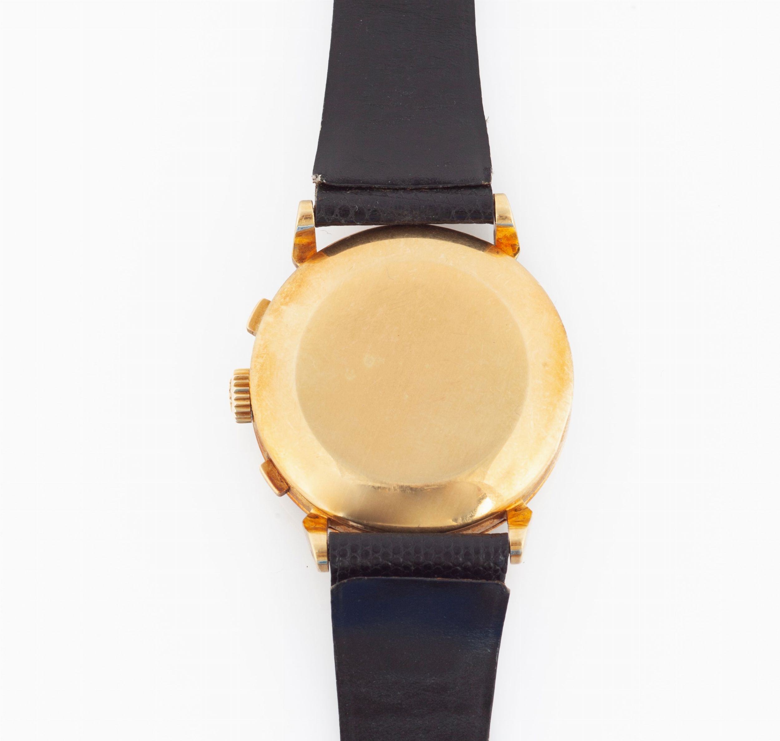 Anni '50 Oro giallo 750/000. Ref. 1579, cassa n° 699374, pulsanti rettangolari, fondello a scatto. Quadrante argentato, indici applicati, quadrantini ausiliari dei secondi e del sommatore minuti, scala tachimetrica, lancette a foglia, movimento manuale n° 868932, 23 rubini, bilanciere monometalico con viti, spirale Breguet, registrazione micrometrica, ruota a colonne.