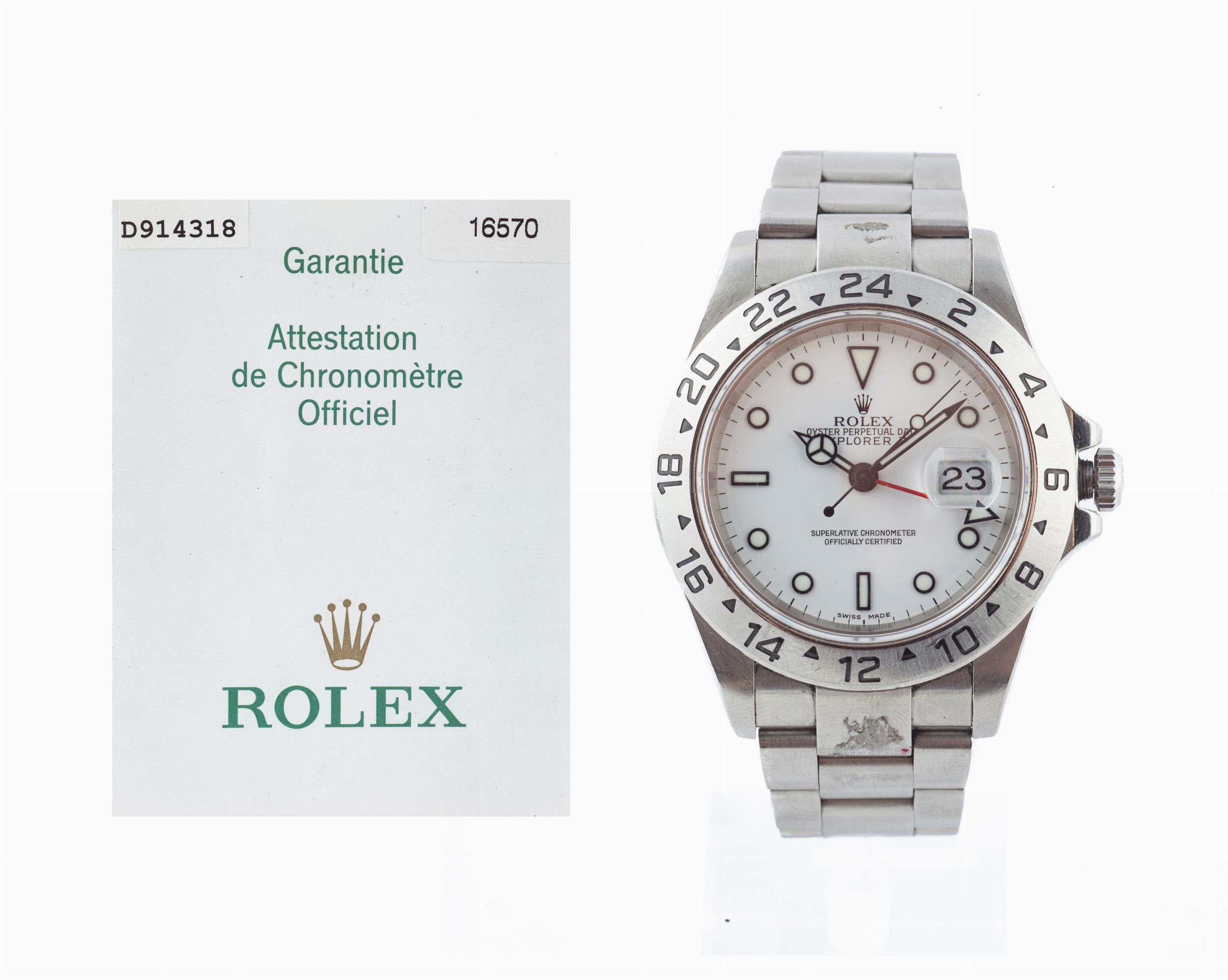 Acciaio, ref. 16570T. Cassa n° D914318, lunetta a 24 ore, spallette di protezione della corona triplock, vetro zaffiro, fondello a vite. Bracciale oyster in acciaio n° 78790, chiusura a deployant. quadrante bianco, indici luminescenti contornati di nero, data a rimessa rapida, lancette luminescenti, secondi al centro, lancetta gmt. Movimento automatico cal 3185, n° 1056339, bilanciere monometalico con viti microstella, spirale piana.