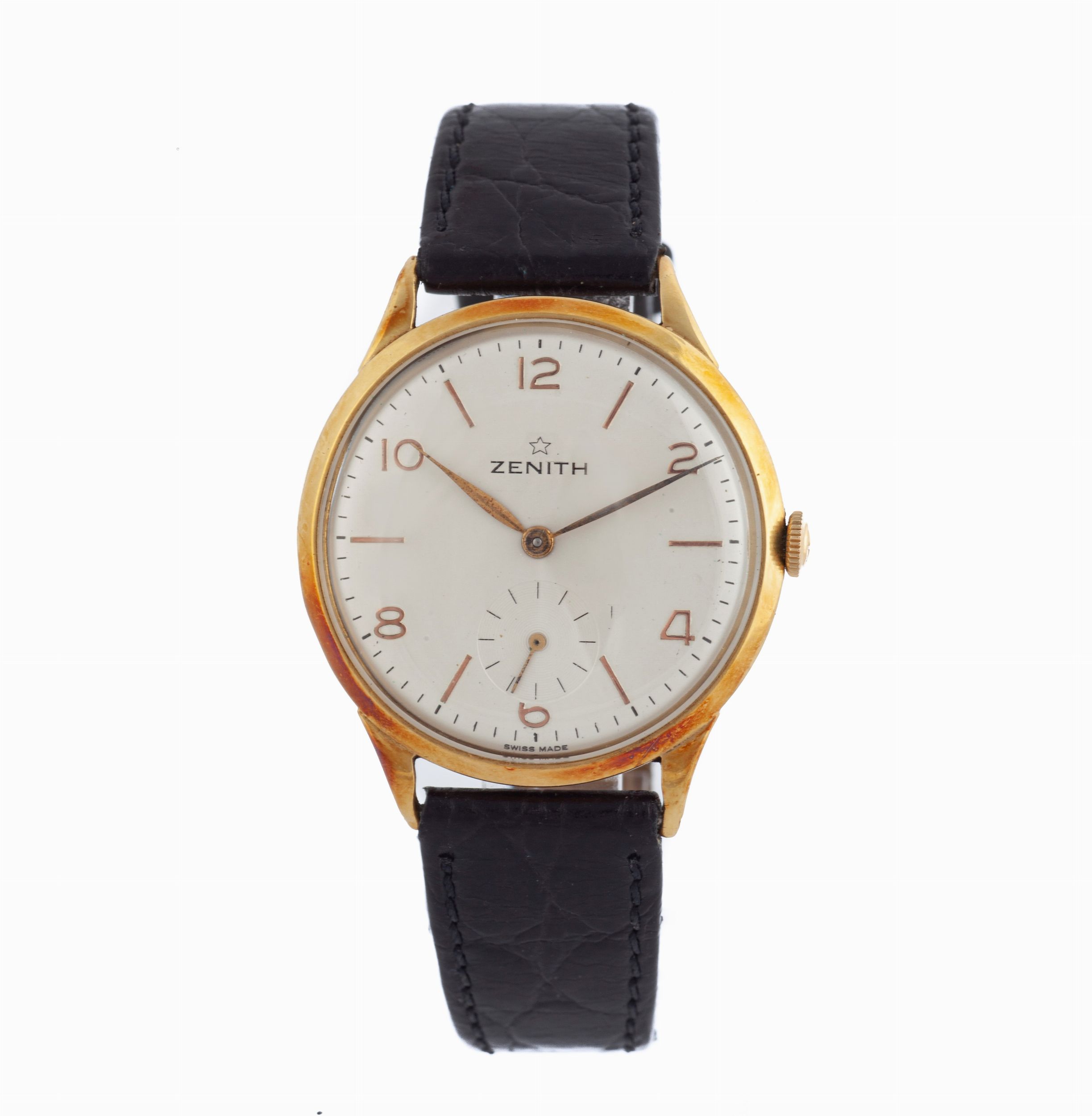 Diametro mm. 36 Anni '50 Oro giallo 750/000. Cassa n° 499467, fondello a scatto, fibbia originale dorata. Quadrante argentato, indici applicati, secondi in basso, labncette a foglia. Movimento manuale dorato n° 4049172, bilanciere monometalico con viti, spirale piana.