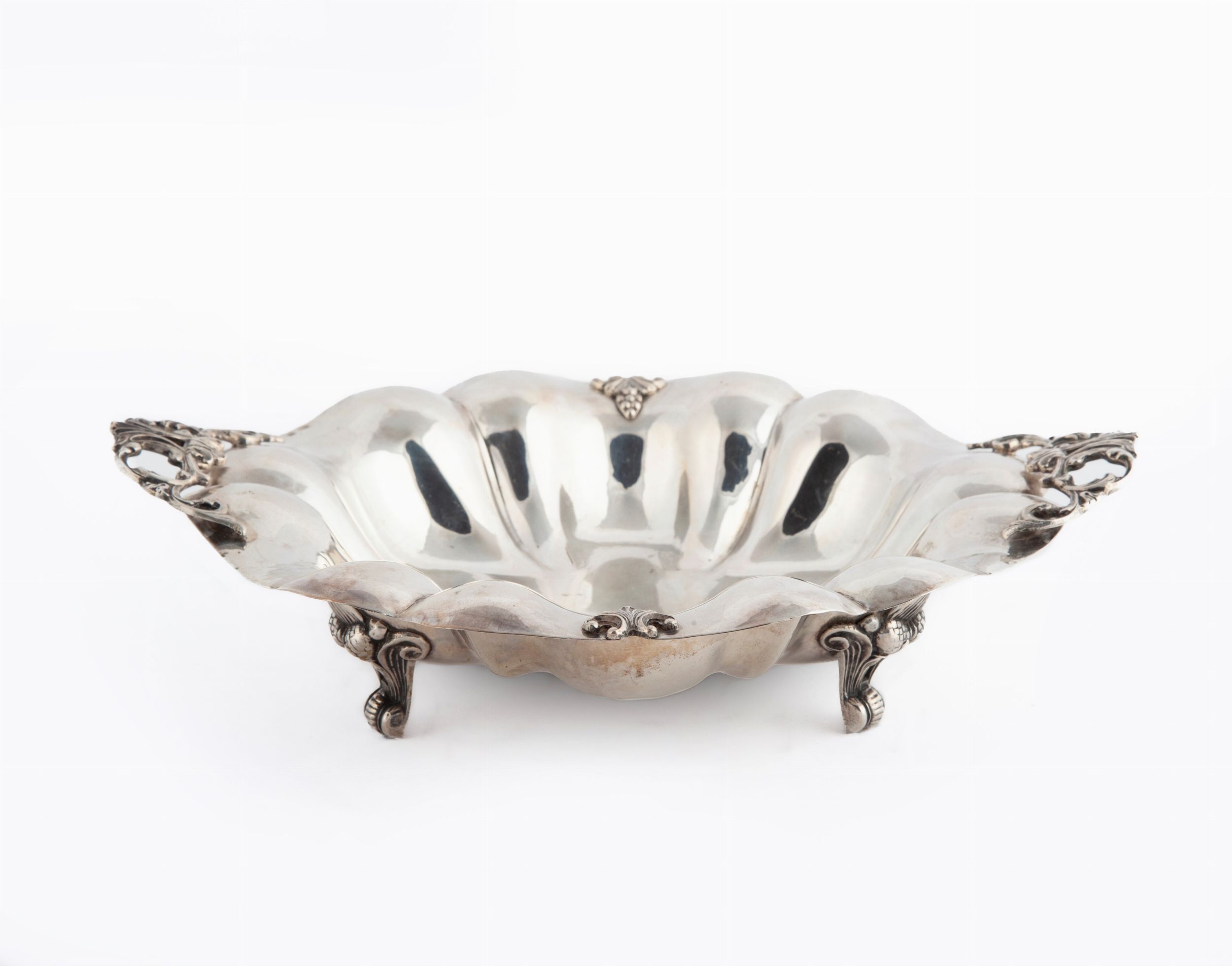 vaschetta ondulata impreziosita da rilievi vegetali applicati, sorretta da tre piedi a mensola