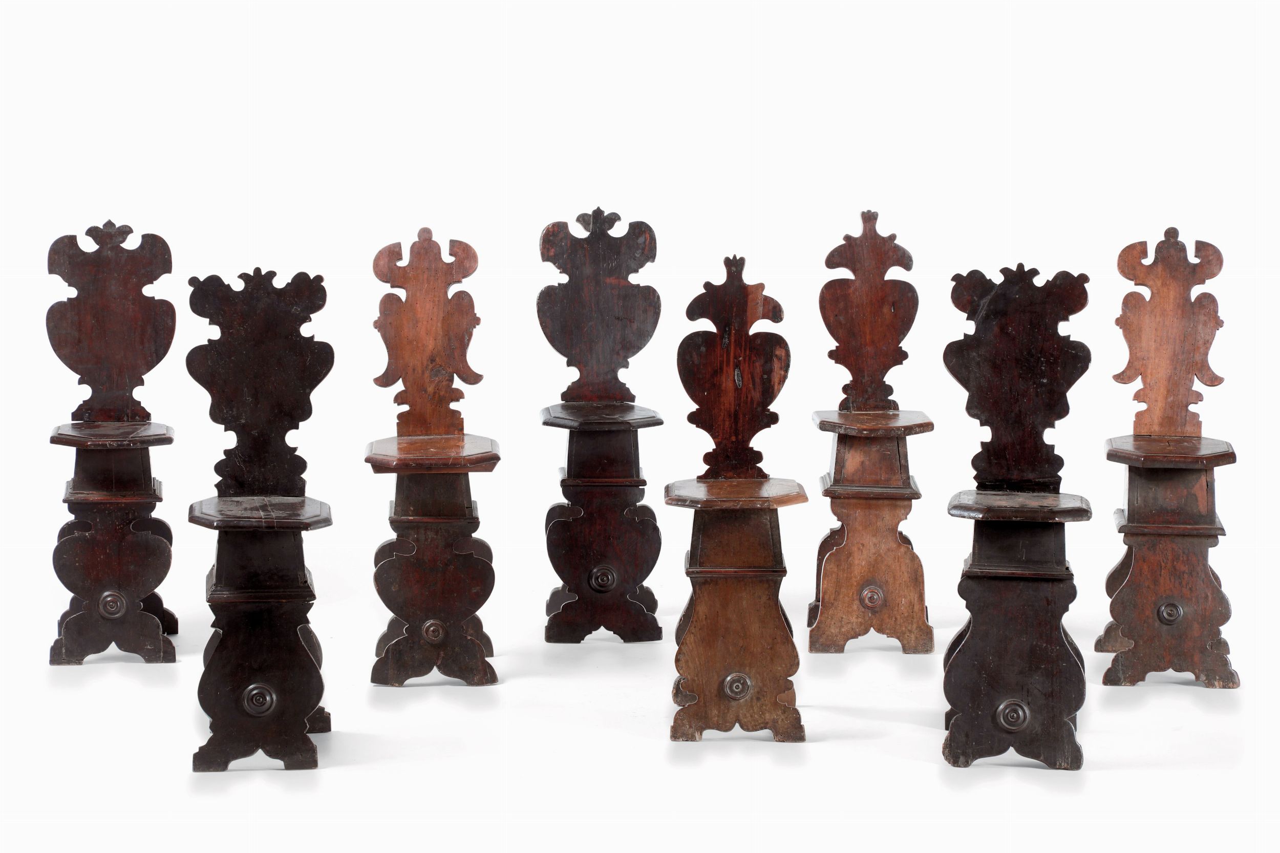Otto sgabelli in noce intagliato. Italia centrale, fine XVII secolo