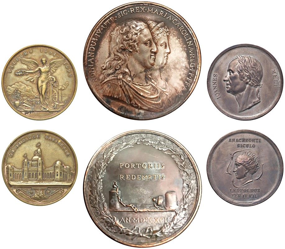 TRE MEDAGLIE BORBONICHE IN BRONZO THREE BOURBONIC BRONZE MEDALS Omaggio del Principe di Salerno, Leopoldo Borbone, a Giovanni Meli 1815; Rara FDC Rare MS Abolizione dei dazi 1792; Rara, pulita ma SPL Rare, cleaned but EF Esposizione nazionale di Palermo 1891-1892; SPL EF