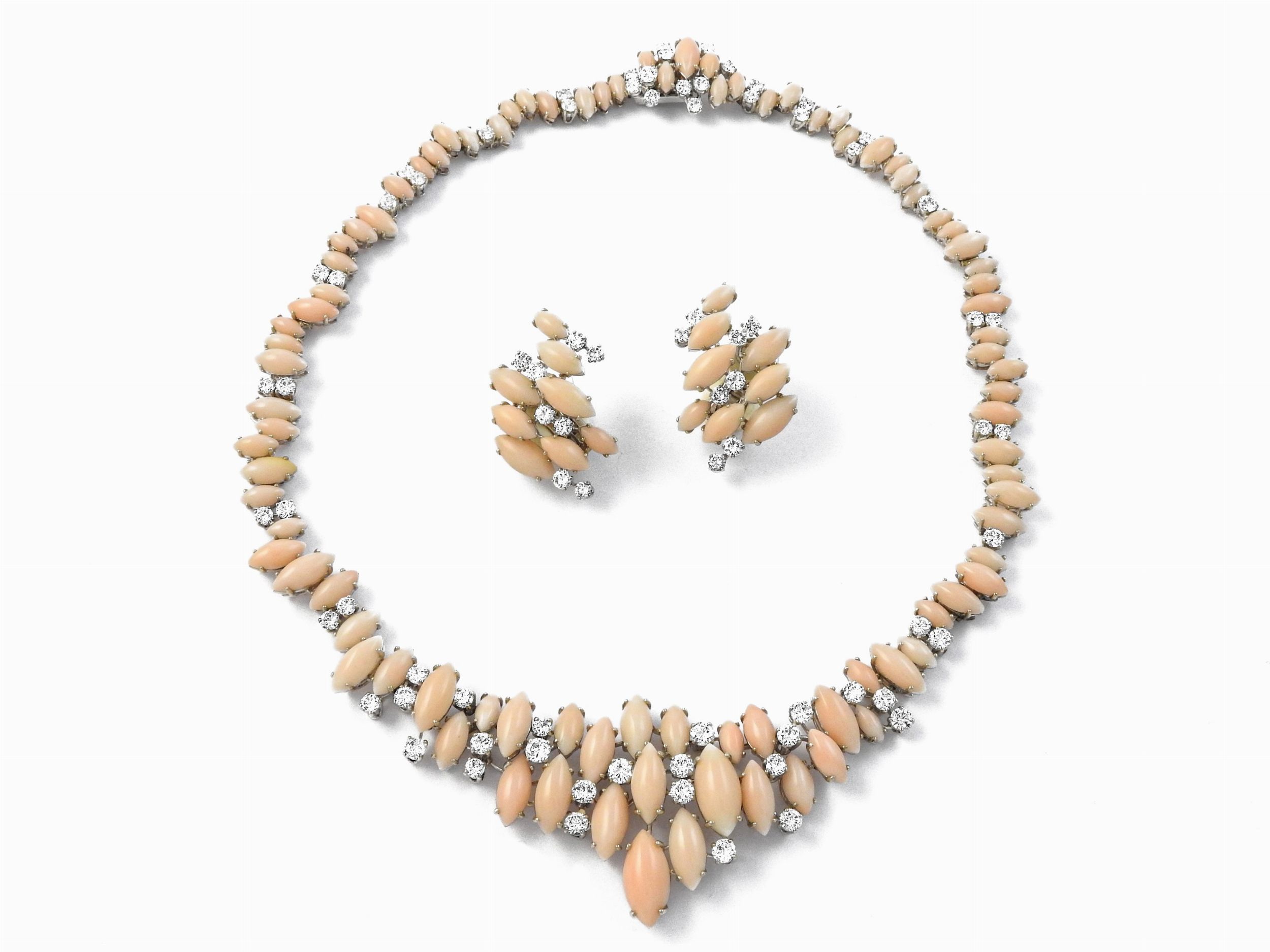 Demi parure collana e orecchini in oro bianco con diamanti e coralli rosa