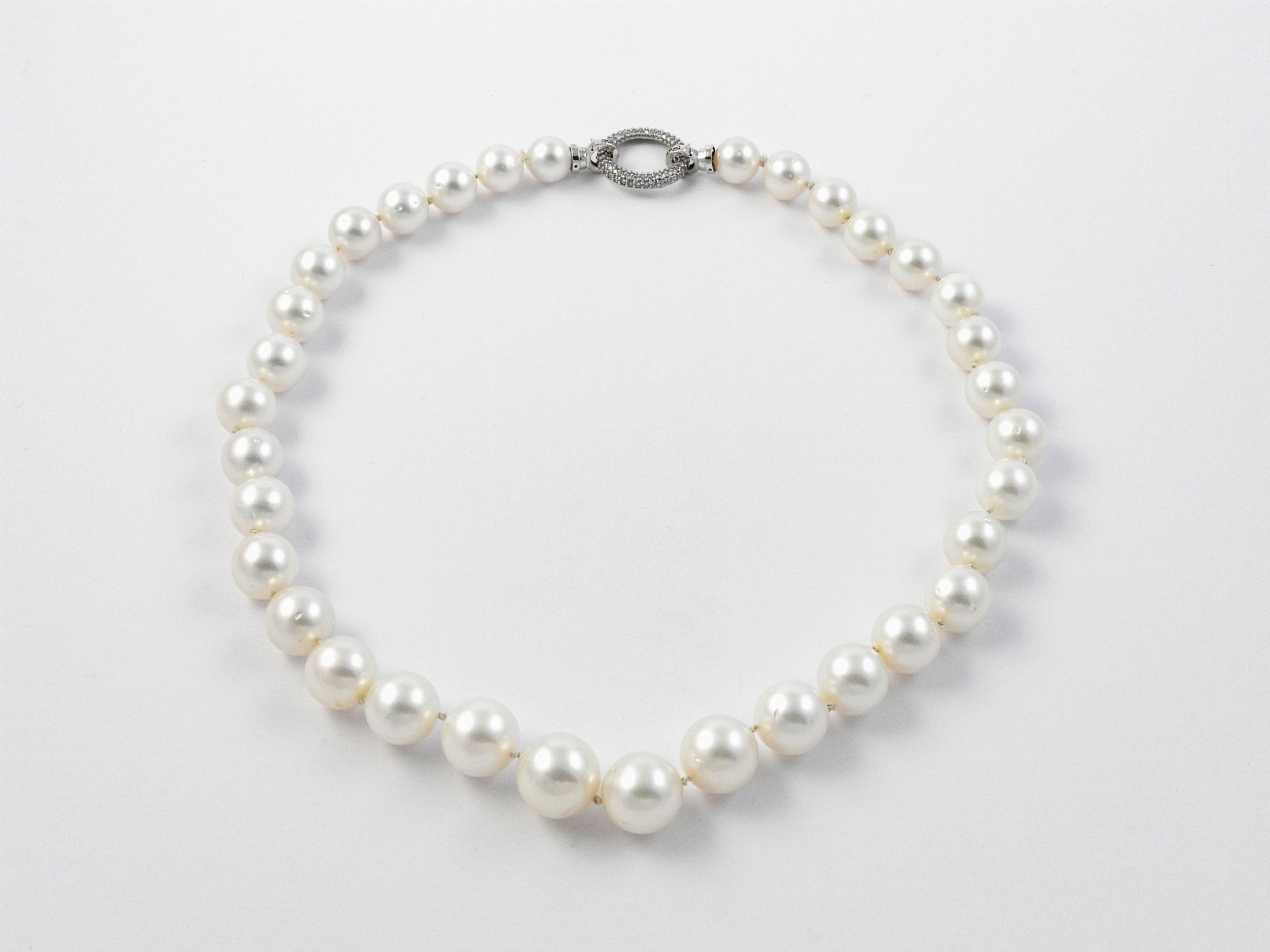 Filo a scalare di perle South Sea bianche con fermezza in oro bianco e diamanti