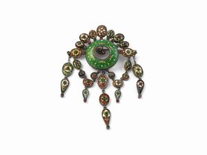 Spilla pendente in argento con smalti policromi e paste vitree